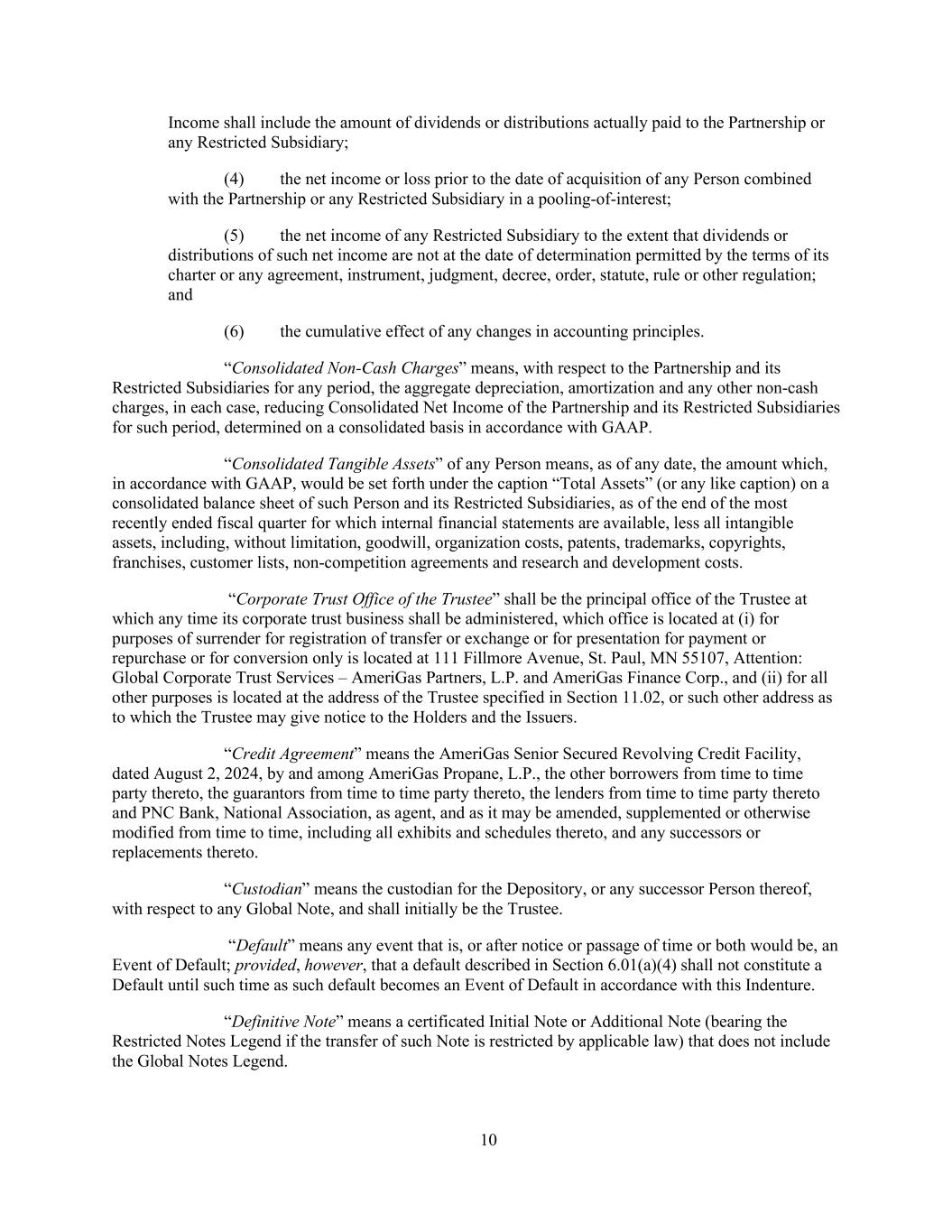 10收益应包括实际支付给合伙企业或任何受限制子公司的股息或分配的金额;(4)与合伙企业或任何受限制子公司合并在一个利息池中的任何人在收购日期之前的净收益或亏损;(5)任何受限制子公司的净收益,前提是该等净收益的股息或分配不在其章程或任何协议、文书、判决、法令、法规的条款允许的确定日期,规则或其他规定;及(6)任何会计原则变更的累积影响。“合并非现金费用”是指,就合伙企业及其受限制子公司的任何期间而言,在每种情况下,减少合伙企业及其受限制子公司在该期间的合并净收入的合计折旧、摊销和任何其他非现金费用,根据公认会计原则在合并基础上确定。任何人的“合并有形资产”是指截至任何日期,根据公认会计原则,截至可获得内部财务报表的最近结束的财政季度末,该人及其受限子公司的合并资产负债表上将在“总资产”(或任何类似标题)标题下列出的金额,减去所有无形资产,包括但不限于商誉、组织成本、专利、商标、版权、特许经营权、客户名单、竞业禁止协议和研发成本。“受托人的公司信托办公室”应是受托人的主要办公室,在任何时候管理其公司信托业务,该办公室位于(i)为转让或交换登记或为付款或回购或仅为转换而提交的目的位于111 Fillmore Avenue,St. Paul,MN 55 107,注意:Global Corporate Trust Services – AmeriGas Partners,L.P.和AmeriGas Finance Corp.,以及(ii)为所有其他目的位于第11.02条规定的受托人地址,或受托人可向持有人及发行人发出通知的其他地址。“信贷协议”指日期为2024年8月2日的AmeriGas Propane,L.P.、不时作为该协议一方的其他借款人、不时作为该协议一方的担保人、不时作为该协议一方的贷款人和不时作为该协议一方的PNC银行、全国协会作为代理人,以及可能不时修订、补充或以其他方式修改的AmeriGas高级有担保循环信贷融资,包括该协议的所有证物和附表,以及该协议的任何继任者或替代者。“托管人”是指任何全球票据的存管人或其任何继承人的托管人,最初应为受托人。“违约”是指属于或在通知或时间流逝后或两者都将属于违约事件的任何事件;但条件是,第6.01(a)(4)节中描述的违约不应构成违约,直到该违约根据本契约成为违约事件。“最终票据”是指不包括全球票据图例的经证明的初始票据或附加票据(如果此类票据的转让受到适用法律的限制,则带有限制性票据图例)。