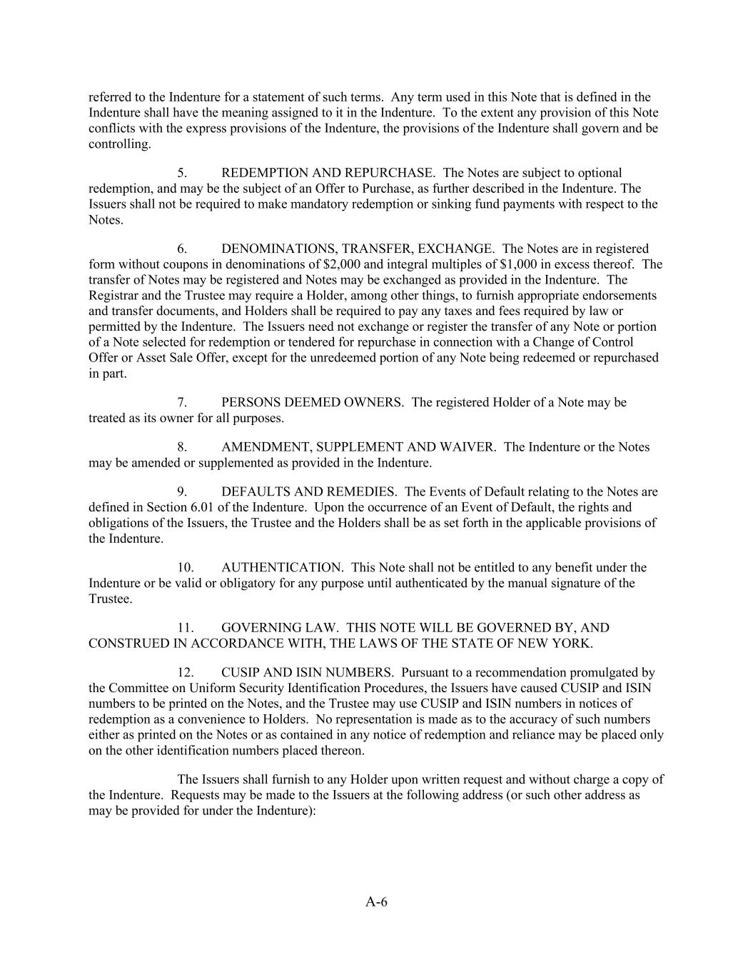 A-6向Indenture提交了此类条款的声明。本说明中使用的任何在义齿中定义的术语应具有义齿中赋予它的含义。如果本说明的任何规定与义齿的明文规定相冲突,义齿的规定应受管辖和控制。5.赎回和回购。这些票据可选择赎回,并且可能是购买要约的标的,如契约中进一步描述的那样。不得要求发行人就票据进行强制赎回或偿债基金支付。6.指认,转让,交换。这些票据采用记名形式,没有面值2000美元和超过1000美元的整数倍的息票。票据的转让可能会被登记,票据可能会按照契约中的规定进行交换。书记官长和受托人可要求持有人(其中包括)提供适当的背书和转让文件,持有人应被要求支付法律要求或契约允许的任何税费。发行人无须就控制权变更要约或资产出售要约交换或登记就控制权变更要约或资产出售要约选择赎回或要约回购的任何票据或票据的部分的转让,但任何票据的未赎回部分被赎回或部分回购的情况除外。7.人被视为所有者。就所有目的而言,票据的注册持有人可被视为其拥有人。8.修正、补充和放弃。义齿或票据可按义齿中的规定进行修订或补充。9.违约和补救措施。与票据有关的违约事件在义齿第6.01节中定义。一旦发生违约事件,发行人、受托人和持有人的权利和义务应按照义齿适用条款的规定。10.认证。在经受托人手工签字认证之前,本票据无权获得义齿项下的任何利益或为任何目的有效或义务。11.治理法。本说明将由纽约州的法律管辖,并根据纽约州的法律进行建造。12.CUSIP和ISIN号码。根据统一证券识别程序委员会颁布的一项建议,发行人已导致在票据上印制CUSIP和ISIN号码,受托人可在赎回通知中使用CUSIP和ISIN号码,以方便持有人。对于印于票据上或任何赎回及依赖通知书所载的该等号码的准确性,概不作出任何陈述,而该等号码只可放置于票据上的其他识别号码上。发行人应应书面请求向任何持有人免费提供义齿副本。可在以下地址(或根据义齿可能规定的其他地址)向发行人提出请求: