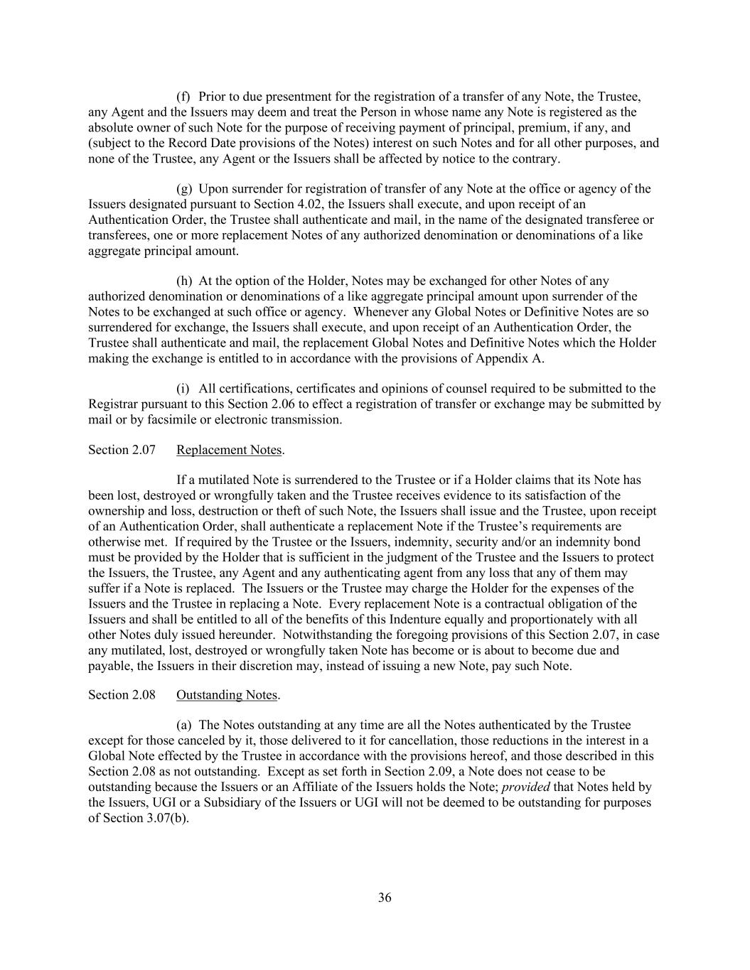 36(f)在任何票据的转让登记到期呈交前,受托人、任何代理人及发行人可将任何票据以其名义登记的人视为并将其视为该票据的绝对拥有人,以收取该等票据的本金、溢价(如有)及(受票据的记录日期规定规限)利息的付款及为所有其他目的,而受托人、任何代理人或发行人均不受相反通知的影响。(g)在依据第4.02条指定的发行人的办事处或代理机构交出任何票据以进行转让登记后,发行人须签立,而在收到认证令后,受托人须以指定的受让人或受让人的名义认证并邮寄一张或多张任何认可面额或相同本金总额面额的替代票据。(h)根据持有人的选择,在交出将在该办事处或代理机构兑换的票据时,可将票据兑换为任何认可面额或相同本金总额面额的其他票据。每当任何全球票据或确定票据如此交还交换时,发行人应执行,而在收到认证令后,受托人应认证并邮寄作出交换的持有人根据附录A的规定有权获得的替换全球票据和确定票据。(i)根据本条2.06规定为进行转让或交换登记而需要提交给书记官长的所有证明、证书和大律师意见可通过邮寄或传真或电子传输方式提交。第2.07节替换说明。被毁损的票据被交还给受托人的,或者持有人声称其票据已遗失、毁损或被错误地取走,且受托人收到其对该票据的所有权和灭失、毁损或失窃感到满意的证据的,发行人应当签发,受托人在收到认证令后,如果受托人的要求在其他方面得到满足,则应当对替换票据进行认证。如果受托人或发行人要求,持有人必须提供足以在受托人和发行人的判断中保护发行人、受托人、任何代理人和任何认证代理人免于他们中的任何人在更换票据时可能遭受的任何损失的赔偿、担保和/或赔偿保证金。发行人或者受托人可以向持有人收取发行人和受托人更换票据的费用。每份替换票据是发行人的合同义务,应有权与根据本协议正式发行的所有其他票据同等和成比例地享有本义齿的所有利益。尽管有本条第2.07款的上述规定,如任何残缺、遗失、毁损或被错误采取的票据已成为或即将成为到期和应付票据,发行人可酌情决定支付该票据,而不是发行新的票据。第2.08款未付票据。(a)任何时候未偿付的票据均为受托人认证的所有票据,但经其注销的票据、交付予其注销的票据、受托人根据本条例的规定对全球票据的权益进行的那些减少以及本条2.08中描述为未偿付的票据除外。除第2.09节规定的情况外,票据不会因为发行人或发行人的关联公司持有票据而停止未偿还;但就第3.07(b)节而言,发行人、UGI或发行人的子公司或UGI持有的票据将不会被视为未偿还。
