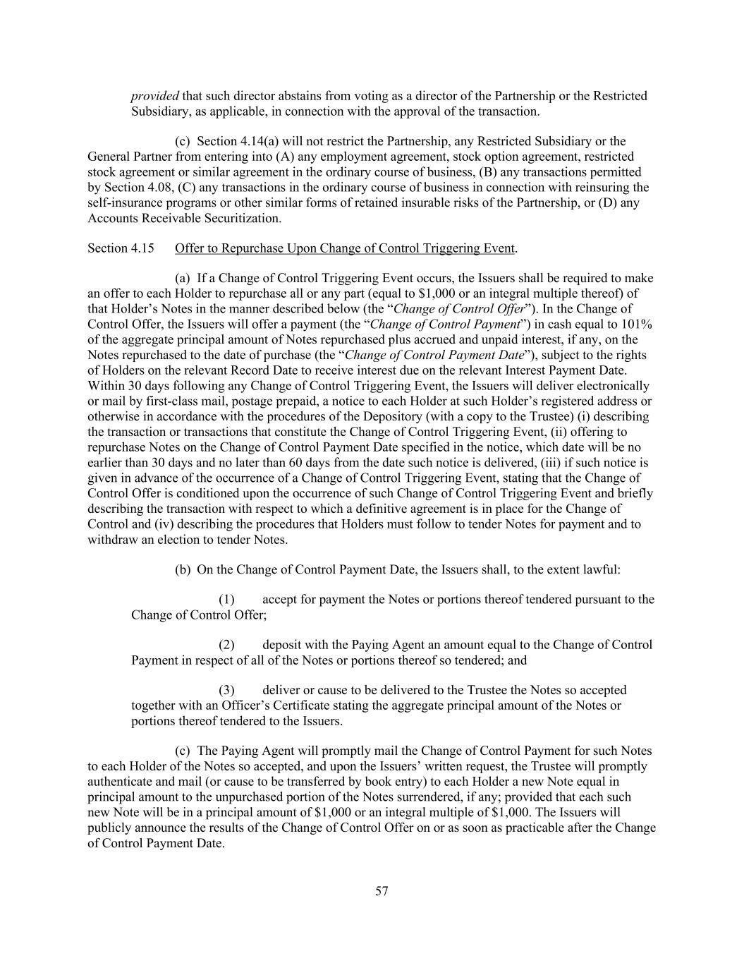 57规定,该董事作为合伙企业或受限制子公司的董事(如适用)在批准交易方面放弃投票。(c)第4.14(a)条将不限制合伙企业、任何受限制的子公司或普通合伙人在正常业务过程中订立(a)任何雇佣协议、股票期权协议、限制性股票协议或类似协议,(b)第4.08条允许的任何交易,(c)正常业务过程中与为自保计划或合伙企业其他类似形式的保留可保风险再保险有关的任何交易,或(d)任何应收账款证券化。第4.15节控制权变更触发事件时的回购要约。(a)如发生控制权变更触发事件,发行人须向每名持有人提出要约,以下述方式回购该持有人票据的全部或任何部分(相当于1,000美元或其整数倍)(“控制权变更要约”)。在控制权变更要约中,发行人将以现金方式要约支付(“控制权变更支付”),金额相当于已购回票据本金总额的101%加上已购回票据至购买日(“控制权变更支付日”)的应计及未付利息(如有),但须受限于相关记录日期的持有人在相关利息支付日收取到期利息的权利。在任何控制权变更触发事件发生后30天内,发行人将按照存管人的程序(连同一份副本交给受托人)以电子方式或以头等邮件、预付邮资的方式向每一持有人送达通知(连同一份副本交给受托人)(i)描述构成控制权变更触发事件的一项或多项交易,(ii)在通知中指定的控制权变更支付日期提出回购票据,(iii)如该通知是在控制权变更触发事件发生之前提前发出的,声明控制权变更要约以发生此类控制权变更触发事件为条件,并简要描述就控制权变更达成最终协议的交易,以及(iv)描述持有人必须遵循的程序,以投标票据进行付款并撤回对投标票据的选择。(b)于控制权变更付款日期,发行人须在合法范围内:(1)接受根据控制权变更要约而呈交的票据或其部分以供支付;(2)就如此呈交的所有票据或其部分向付款代理人存入相等于控制权变更付款的款额;及(3)将如此接受的票据连同述明向发行人呈交的票据或其部分本金总额的高级人员证明书交付或安排交付予受托人。(c)付款代理人将迅速将此类票据的控制权变更付款邮寄给如此接受的票据的每一持有人,根据发行人的书面请求,受托人将迅速认证并向每一持有人邮寄(或促使以簿记方式转让)本金等于所交回票据的未购买部分(如有)的新票据;但每份此类新票据的本金金额将为1000美元或1000美元的整数倍。发行人将于控制权变更支付日当日或之后的实际可行时间内尽快对外公布控制权变更要约的结果。