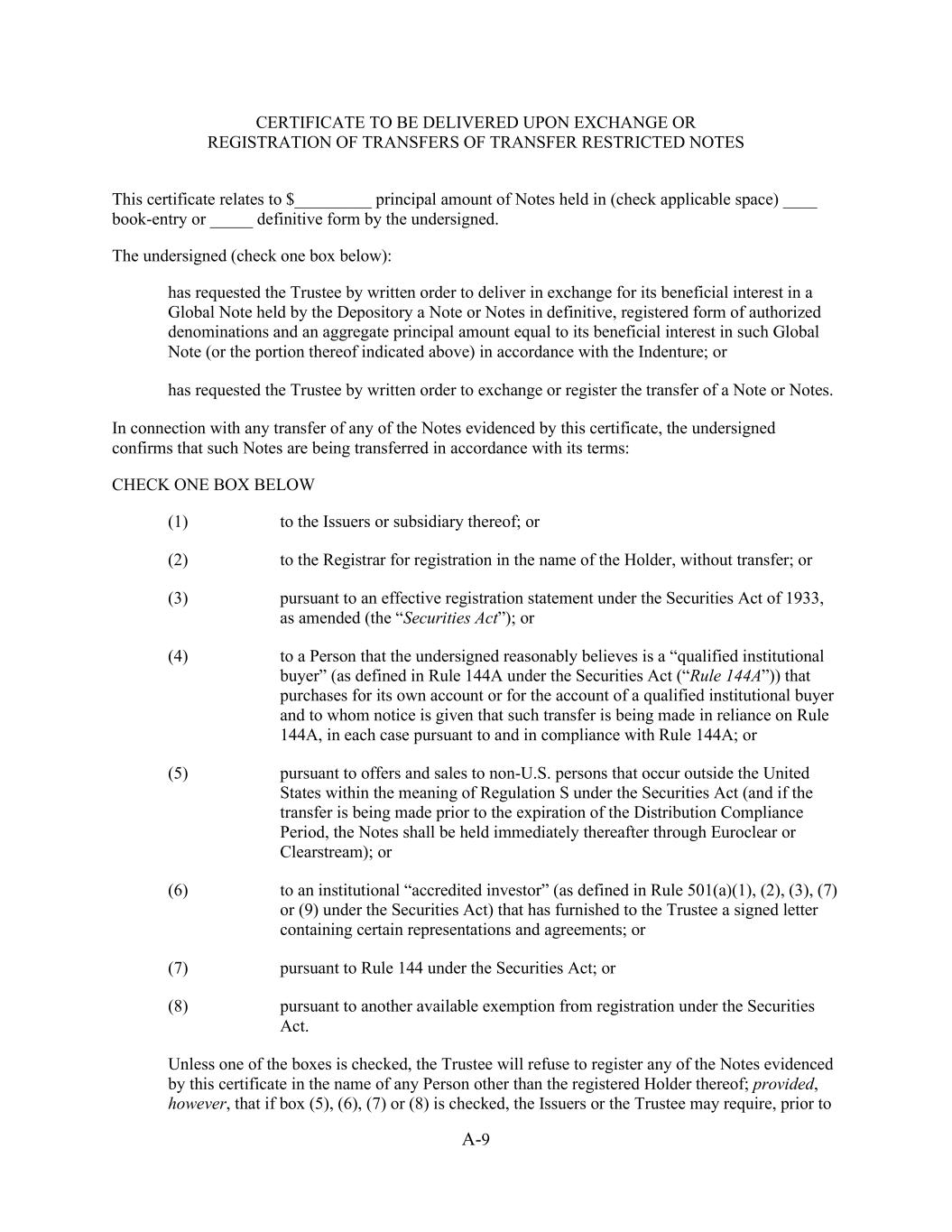 A-9证书将在交易所或转让受限制票据的转让登记时交付本证书涉及由以下签署人在(检查适用空间)_____簿记或______最终格式中持有的__________美元票据本金金额。以下签署人(在下面勾选一个方框):已通过书面命令要求受托人交付一张或多张最终注册形式的授权面额的票据,并根据义齿交付本金总额等于其在该全球票据(或上述部分)中的实益权益的本金总额,以换取其在存管人持有的全球票据中的实益权益;或已通过书面命令要求受托人交换或登记一张或多张票据的转让。就本证明书所证明的任何票据的任何转让而言,以下签署人确认该等票据是根据其条款转让的:勾选以下一个方框(1)予发行人或其附属公司;或(2)予登记处处长以持有人名义登记,无须转让;或(3)根据1933年《证券法》下的有效登记声明,经修订(《证券法》);或(4)以下签署人合理地认为是“合格机构买方”(定义见《证券法》第144A条(“第144A条”))的人,该人为自己的账户或为合格机构买方的账户进行购买,并向其发出通知,称正在依据第144A条进行此类转让,在每种情况下,根据和遵守规则144A;或(5)根据《证券法》第S条规定的条例所指的在美国境外发生的向非美国人的要约和销售(如果转让是在分配合规期届满之前进行的,则票据应在此后立即通过Euroclear或Clearstream持有);或(6)向机构“认可投资者”(定义见规则501(a)(1)、(2)、(3),(7)或(9)根据《证券法》)已向受托人提供载有某些陈述和协议的已签署信函;或(7)根据《证券法》第144条规则;或(8)根据《证券法》下另一项可用的登记豁免。除非选中其中一个方框,否则受托人将拒绝将本证明书所证明的任何票据以其注册持有人以外的任何人的名义注册;但如选中第(5)、(6)、(7)或(8)个方框,发行人或受托人可要求,在