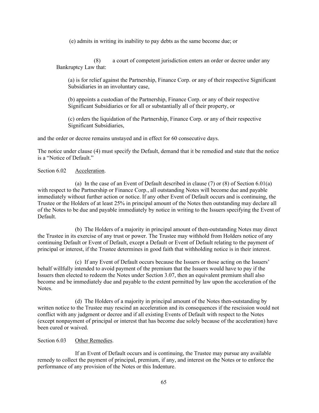 65(e)书面承认无力支付到期债务;或(8)有管辖权的法院根据任何破产法下达命令或判令:(a)在非自愿情况下针对合伙企业、财务公司或其各自的任何重要子公司提供救济,(b)指定合伙企业、财务公司或其各自的任何重要子公司或其全部或基本全部财产的托管人,或(c)命令对合伙企业、财务公司或其各自的任何重要子公司进行清算,并且该命令或法令在连续60天内仍未停止和有效。第(4)条下的通知必须指明违约,要求对其进行补救,并说明该通知是“违约通知”。第6.02节加速。(a)如发生第6.01(a)条第(7)或(8)款所述有关合伙企业或财务公司的违约事件,所有未偿还票据将立即到期应付,而无须采取进一步行动或发出通知。倘任何其他违约事件发生且仍在继续,受托人或当时未偿还票据本金至少25%的持有人可通过向发行人发出书面通知并指明违约事件的方式宣布所有票据立即到期应付。(b)当时未偿还票据本金多数的持有人可指示受托人行使任何信托或权力。受托人可以向持有人扣留任何持续违约或违约事件的通知,但与支付本金或利息有关的违约或违约事件除外,如果受托人善意地确定扣留通知符合他们的利益。(c)如任何违约事件是由于发行人或代表发行人行事的人故意有意避免支付发行人随后根据第3.07条选择赎回票据而须支付的溢价而发生的,则在票据加速发行时,等值溢价也应成为并立即到期并在法律允许的范围内支付。(d)如撤销不会与任何判决或判令相冲突,且有关票据的所有现有违约事件(仅因加速而到期的未支付本金或利息除外)均已得到纠正或豁免,则持有当时未偿付的票据本金多数的持有人可藉向受托人发出书面通知,撤销加速及其后果。第6.03节其他补救办法。如果违约事件发生并仍在继续,受托人可寻求任何可用的补救措施,以收取票据的本金、溢价(如有)和利息的付款,或强制履行票据或本契约的任何条款。