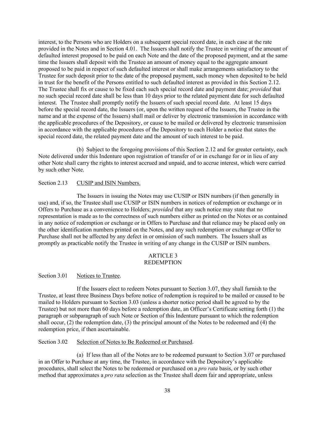 38利息,支付给在随后的特别记录日期持有人,在每种情况下按票据和第4.01节规定的利率支付。发行人应将每份票据拟支付的违约利息金额和拟支付的日期书面通知受托人,同时发行人应向受托人存入相当于就该等违约利息拟支付的总额的金额,或应在拟支付的日期之前就该等存款作出受托人满意的安排,为有权获得本条第2.12条所规定的违约利息的人的利益而存入以信托形式持有的该等款项。受托人应确定或促使确定每个该等特别记录日期和付款日期;但任何该等特别记录日期不得少于该等违约利息的相关付款日期前10天。受托机构应将该特殊股权登记日及时通知发行人。发行人(或应发行人的书面请求,以发行人名义并由发行人承担费用的受托人)应在特别记录日期前至少15日,按照存管人的适用程序以电子传输方式邮寄或交付,或促使按照存管人的适用程序以电子传输方式向每一持有人邮寄或交付一份说明特别记录日期、相关支付日期及须支付该利息金额的通知。(b)除本条第2.12条前述条文另有规定外,为更大的确定性,在任何其他票据的转让登记或交换或代替任何其他票据时根据本指引交付的每份票据,均须载有该其他票据所载的应计未付利息及应计利息的权利。第2.13节CUSIP和ISIN号码。发行人在发行票据时可以使用CUSIP或ISIN号码(如果当时一般使用),如果使用,受托人应在赎回或交换通知或购买要约中使用CUSIP或ISIN号码,以方便持有人;但任何该等通知可述明,对于印在票据上或任何赎回或交换通知或购买要约中所载的该等号码的正确性,并无作出任何陈述,且可仅依赖印在票据上的其他识别号码,及任何该等赎回或交换或购买要约不受该等数字的任何缺陷或遗漏的影响。发行人应在切实可行的范围内尽快将CUSIP或ISIN号码的任何变更以书面形式通知受托人。第三条赎回第3.01款通知受托人。发行人如依据第3.07条选择赎回票据,须向受托人提供一份载明(1)该等票据的段落或分段或根据第3.03条安排将赎回通知邮寄或安排邮寄予持有人的高级人员证明书,该等证明书须于赎回日期前至少三个营业日(除非受托人同意较短的通知期)但不多于60天,(2)赎回日期,(3)待赎回票据的本金金额及(4)赎回价格(如当时可确定)。第3.02节选择被赎回或购买的票据。(a)如根据第3.07条须赎回或在任何时间以购买要约购买的票据少于全部,则受托人须按照存管人的适用程序,按比例选择拟赎回或购买的票据,或按受托人认为公平及适当的近似按比例选择的其他方法,除非