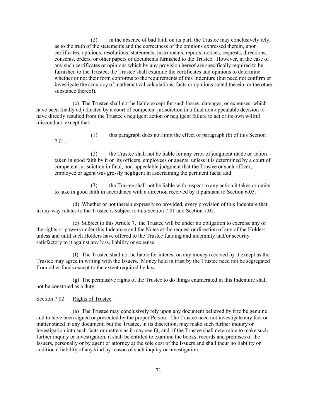 71(2)在受托人方面没有恶意的情况下,受托人可就陈述的真实性和其中所表达的意见的正确性,最终依赖向受托人提供的证明、意见、决议、陈述、文书、报告、通知、请求、指示、同意书、命令或其他文件或文件。然而,如本协议任何条文特别规定须向受托人提供任何该等证明或意见,则受托人须审查该等证明或意见,以确定其形式是否符合本义齿的要求(但无须确认或调查其中所述的数学计算、事实或意见或其其他实质内容的准确性)。(c)受托人无须承担法律责任,但有关的损失、损害或开支,已由有管辖权的法院在最终不可上诉的决定中最终裁定是由受托人的过失作为或过失不作为或其本身的故意不当行为直接导致的,但以下情况除外:(1)本款并不限制本条第7.01条(b)款的效力;(2)受托人无须对其或其高级人员作出的任何错误判断或善意采取的行动承担法律责任,雇员或代理人,除非有管辖权的法院在最终的、不可上诉的判决中裁定受托人或该高级职员、雇员或代理人在确定有关事实方面严重疏忽;及(3)受托人无须就其根据第6.05条所接获的指示而善意采取或不采取的任何行动承担法律责任。(d)不论其中是否明文如此规定,本指引的每项以任何方式与受托人有关的条文,均受本条第7.01条及第7.02条规限。(e)在符合本条第7款的规定下,受托人将没有义务应任何持有人的请求或指示行使本契约和票据下的任何权利或权力,除非且直至该等持有人向受托人提供了其对任何损失、责任或费用感到满意的资金和赔偿和/或担保。(f)除非受托人与发行人书面协议,否则受托人无须就其所收款项的利息承担法律责任。受托人以信托方式持有的资金,除法律规定的范围外,无需与其他资金隔离。(g)受托人作出本指引所列举的事情的允许权,不得解释为一项责任。第7.02条受托人的权利。(a)受托人可决定性地依赖其认为是真实的并已由适当人士签署或出示的任何文件。受托人无须调查任何文件所述的任何事实或事项,但受托人可酌情对其认为合适的事实或事项作出进一步查询或调查,如受托人决定作出该等进一步查询或调查,则有权亲自或由代理人或律师审查发行人的簿册、记录和处所,费用由发行人承担,且不因此类查询或调查而承担任何责任或额外责任。