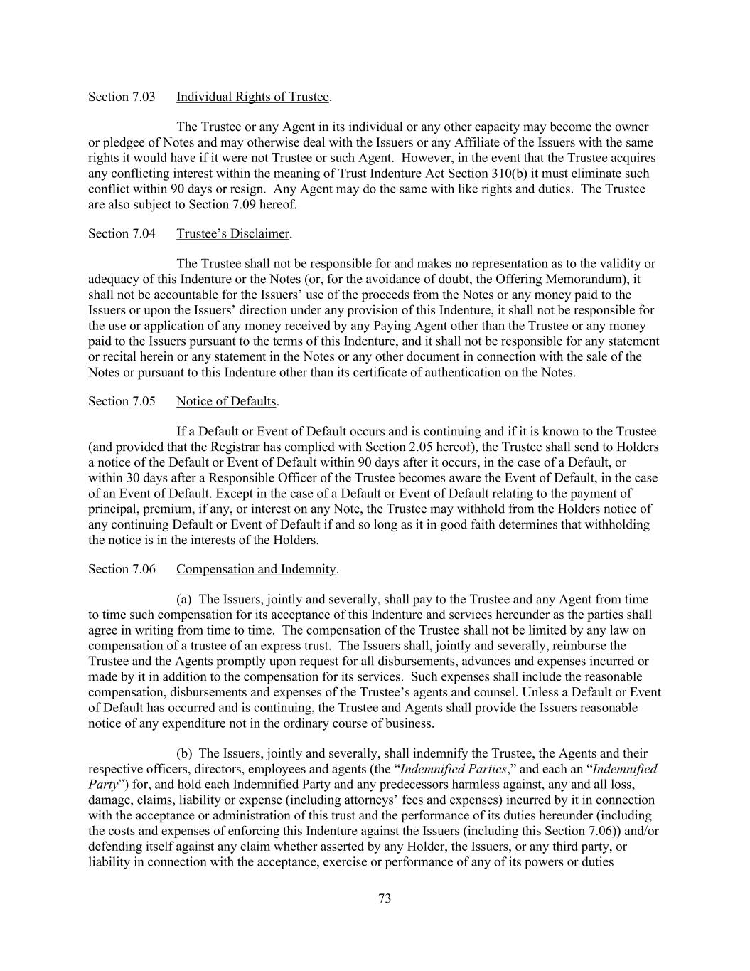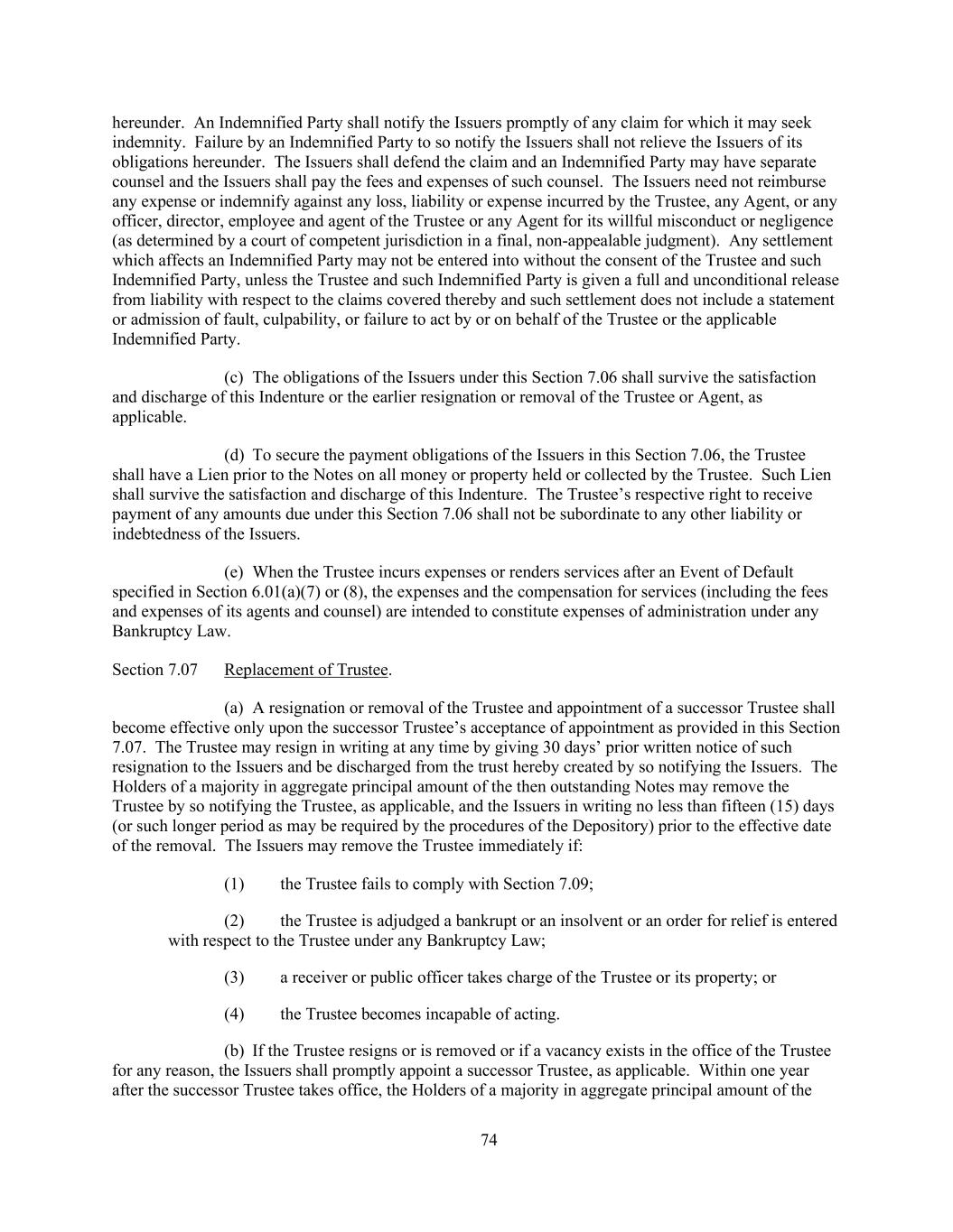 73第7.03节受托人的个人权利。受托人或以其个人或任何其他身份的任何代理人可以成为票据的所有人或质权人,并可以其他方式与发行人或发行人的任何关联人处理其在不是受托人或该代理人时将拥有的相同权利。然而,如果受托人获得《信托契约法》第310(b)条含义内的任何冲突利益,则必须在90天内消除此类冲突或辞职。任何代理人都可以做同样的权利和义务。受托人还受本协议第7.09条的约束。第7.04节受托人的免责声明。受托人不得就本契约或票据(或为免生疑问而订立发售备忘录)的有效性或充分性负责或作出任何陈述,亦不得就发行人使用票据所得款项或向发行人支付的任何款项或根据发行人根据本契约任何条文作出的指示负责,它不负责使用或应用除受托人以外的任何付款代理人收到的任何款项或根据本契约条款支付给发行人的任何款项,并且它不负责此处的任何陈述或陈述或票据或与票据销售有关的任何其他文件中的任何陈述或根据本契约的任何其他文件,但其在票据上的认证证书除外。第7.05节违约通知。如违约或违约事件已发生且仍在继续,且如受托人已知悉(且条件是书记官长已遵守本条例第2.05条),则受托人应在违约或违约事件发生后90天内(如属违约)或在受托人的负责人员知悉违约事件后30天内(如属违约事件)向持有人发出违约或违约事件通知。除与任何票据的本金、溢价(如有的话)或利息的支付有关的违约或违约事件外,受托人可向持有人扣留任何持续违约或违约事件的通知,前提是且只要其善意地确定扣留通知符合持有人的利益。第7.06节赔偿和赔偿。(a)发行人须共同及分别向受托人及任何代理人不时支付各方不时以书面议定的就其接受本契约及根据本契约提供的服务而作出的补偿。受托人的赔偿不受明示信托受托人赔偿法律的限制。发行人除对其服务的补偿外,对其发生或发生的一切支出、垫款和费用,应请求及时向受托人和代理人进行连带偿付。此类费用应包括受托人的代理人和律师的合理补偿、支出和费用。除非违约或违约事件已经发生且仍在继续,否则受托人和代理人应就非正常业务过程中的任何支出向发行人提供合理通知。(b)发行人须共同及个别向受托人、代理人及其各自的高级人员、董事、雇员及代理人(“受偿方、和每一“受偿方”),并使每一受偿方和任何前任免受损害,其因接受或管理本信托以及履行其在本协议项下的职责而产生的任何和所有损失、损害、索赔、责任或费用(包括律师费和开支)(包括向发行人强制执行本契约的成本和开支(包括本第7.06条))和/或为自己辩护的任何索赔,无论是否由任何持有人、发行人或任何第三方主张,或与接受有关的责任,行使或履行其任何权力或职责