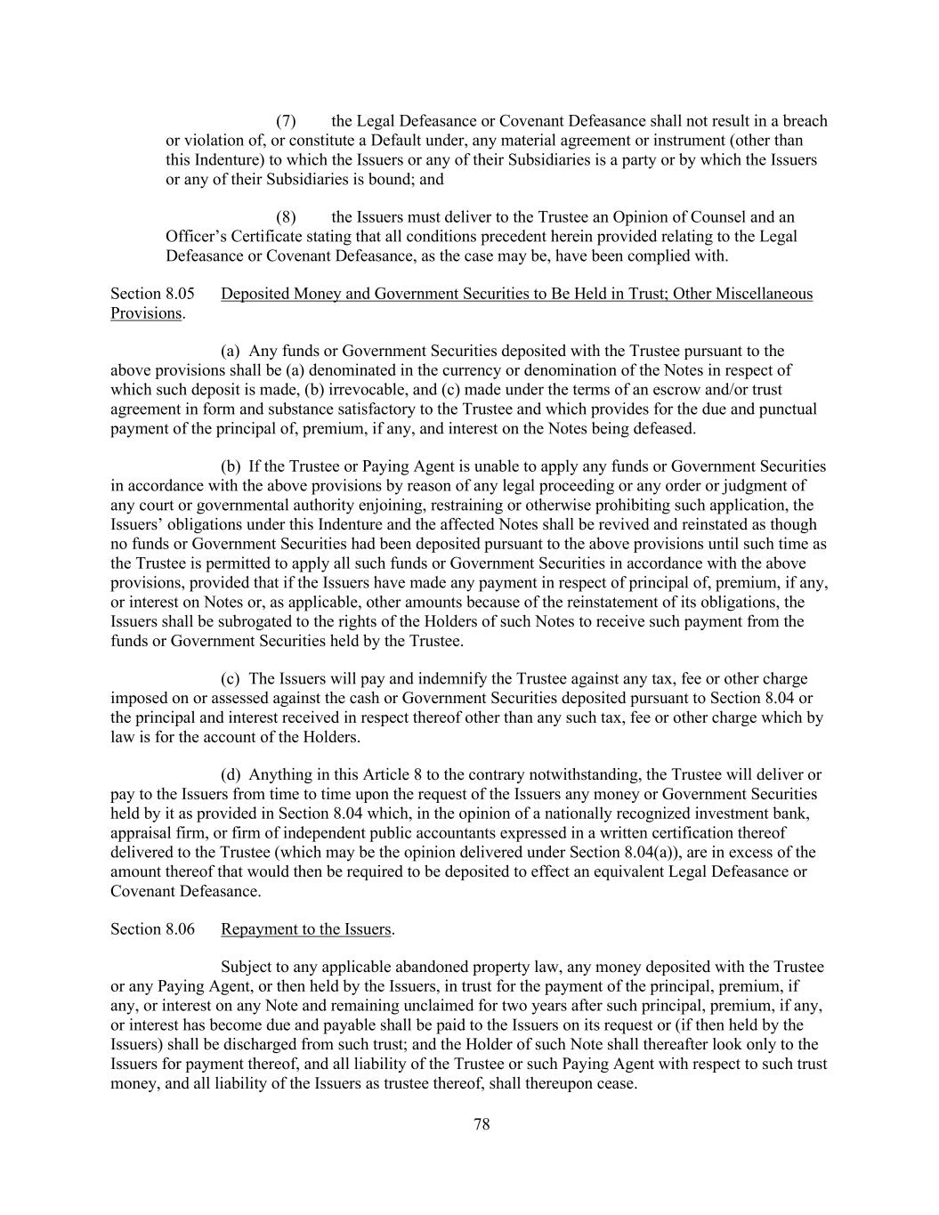 78(7)法律失责或契约失责不会导致违反或违反发行人或其任何附属公司为一方或发行人或其任何附属公司受其约束的任何重要协议或文书(本契约除外),或构成违约;及(8)发行人必须向受托人交付一份大律师意见及一份高级人员证明书,述明此处提供的与法律失责或契约失责(视属何情况而定)有关的所有先决条件均已获遵守。第8.05款存放款项和拟以信托方式持有的政府证券;其他杂项规定。(a)依据上述条文存放于受托人的任何资金或政府证券,须(a)以作出该等存款所关乎的票据的货币或面额计值,(b)不可撤销,及(c)根据托管和/或信托协议的条款作出,其形式和实质均令受托人满意,并规定到期及准时支付被作废票据的本金、溢价(如有的话)及利息。(b)如受托人或付款代理人因任何法律程序或任何法院或政府当局的任何命令或判决禁止、限制或以其他方式禁止该等申请而不能按照上述规定申请任何资金或政府证券,则发行人在本契约及受影响票据下的义务须恢复及恢复,犹如并无根据上述规定存放任何资金或政府证券,直至受托人获准按照上述规定申请所有该等资金或政府证券为止,但如发行人因其债务的恢复而就票据的本金、溢价(如有)或利息或(如适用)其他款项作出任何付款,则发行人须代位行使该等票据持有人从受托人持有的基金或政府证券收取该等付款的权利。(c)发行人将就依据第8.04条存放的现金或政府证券所征收或评估的任何税项、费用或其他费用,或就该等所收取的本金及利息,向受托人支付及赔偿,但法律上由持有人负担的任何该等税项、费用或其他费用除外。(d)即使本条第8条有任何相反规定,受托人仍会应发行人的要求,不时向发行人交付或支付其持有的第8.04条规定的任何款项或政府证券,而该等款项或政府证券经国家认可的投资银行、评估事务所或独立公共会计师事务所以书面证明(可能是根据第8.04(a)条交付的意见)表示,超出了随后将被要求存入以实现同等法律违约或契约违约的金额。第8.06节偿还发行人。在符合任何适用的废弃物权法的规定下,任何存放于受托人或任何付款代理人的款项,或随后由发行人以信托方式持有以支付任何票据的本金、溢价(如有的话)或利息,但在该等本金、溢价(如有的话)或利息到期应付后两年内仍无人认领的款项,应应发行人的请求支付给发行人,或(如当时由发行人持有)应解除该信托;而该票据的持有人此后应仅向发行人寻求支付,而受托人或该等付款代理人就该等信托款项所负的一切法律责任,以及发行人作为其受托人的一切法律责任,随即终止。