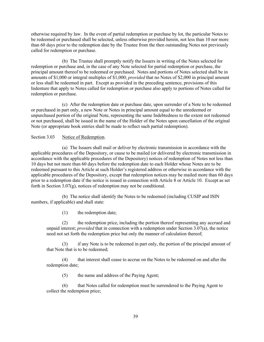 39法律另有规定。在发生部分赎回或以抽签方式购买的情况下,除非本文另有规定,否则应在受托人赎回日期前不少于10天或不超过60天,从先前未被要求赎回或购买的当时未偿还的票据中选择将被赎回或购买的特定票据。(b)受托人应迅速以书面通知发行人选择赎回或购买的票据,如任何票据选择部分赎回或购买,则应将赎回或购买的本金金额通知发行人。选定的票据和部分票据的金额应为1000美元或1000美元的整数倍;但不得部分赎回本金2000美元或以下的票据。除前一句规定外,本契约中适用于被要求赎回或购买的票据的规定也适用于被要求赎回或购买的部分票据。(c)在赎回日期或购买日期后,在交出拟赎回或仅部分购买的票据时,须在原票据注销时以票据持有人的名义发行本金金额等于原票据未赎回或未购买部分的新票据或票据,在未赎回或未购买的范围内代表相同的债务(或须作出适当的账簿分录以反映该部分赎回)。第3.03节赎回通知。(a)发行人应按照存管人的适用程序邮寄或以电子传送方式交付,或安排在赎回日期前不少于10日但不超过60日将票据赎回通知邮寄(或按照存管人的适用程序以电子传送方式交付)至其根据本条将在该持有人的注册地址或按照存管人的适用程序以其他方式赎回票据的每一持有人,但与第八条、第十条有关的通知发出的,可以在赎回日前60天以上邮寄赎回通知的除外。除第3.07(g)条规定的情况外,赎回通知可能不是有条件的。(b)通知书须指明将予赎回的票据(如适用,包括CUSIP及ISIN号码),并须述明:(1)赎回日期;(2)赎回价格,包括其中代表任何应计及未付利息的部分;但就根据第3.07(a)条作出的赎回而言,通知书无须列明赎回价格,而只须列明其计算方式;(3)如任何票据只须部分赎回,该票据的本金将被赎回的部分;(4)在赎回日期当日及之后将被赎回的票据将停止产生利息;(5)支付代理的名称和地址;(6)要求赎回的票据必须交还给支付代理以收取赎回价款;