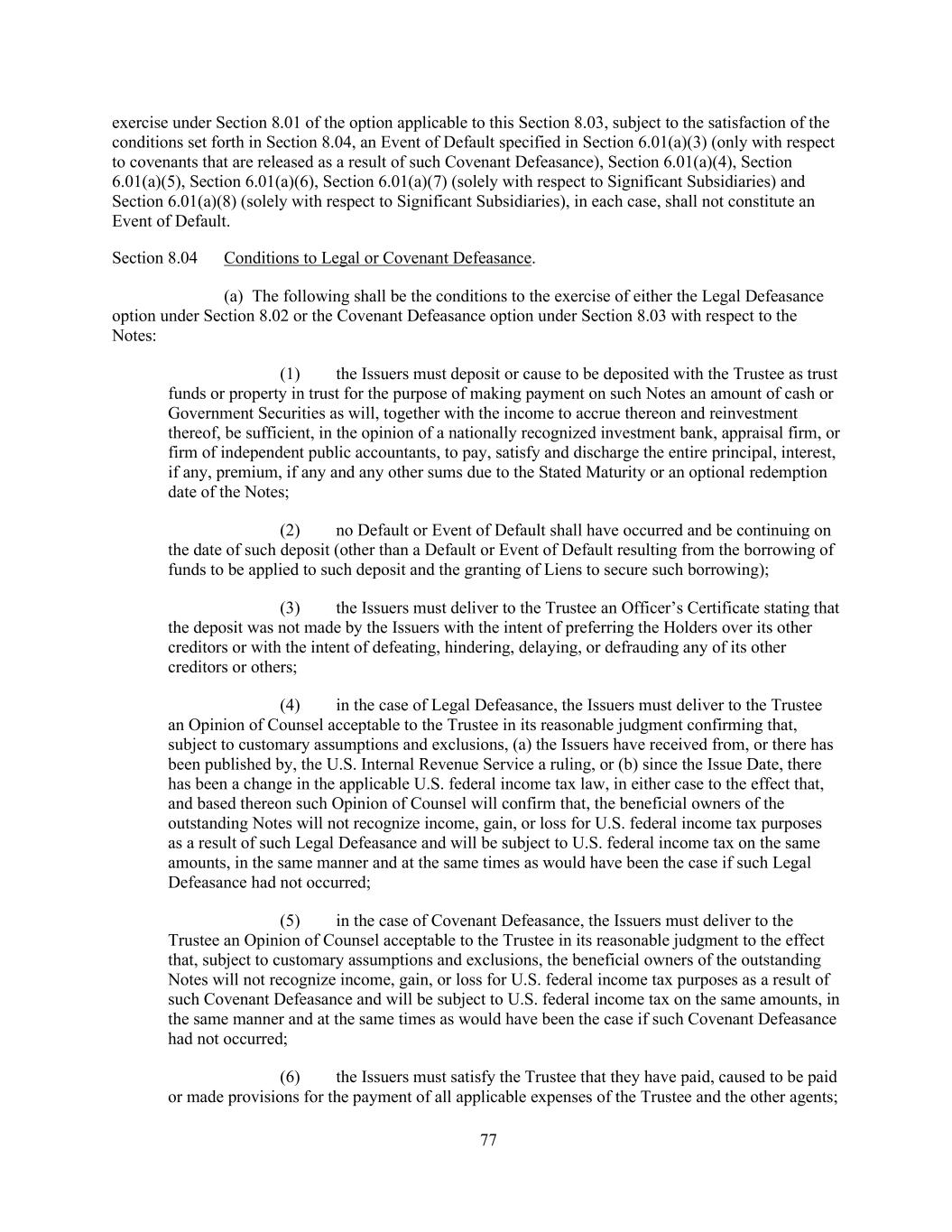 77根据适用于本第8.03条的选择权第8.01条行使,但须满足第8.04条规定的条件,第6.01(a)(3)条规定的违约事件(仅涉及因该等违约而解除的契诺)、第6.01(a)(4)条、第6.01(a)(5)条、第6.01(a)(6)条、第6.01(a)(7)条(仅针对重要子公司)和第6.01(a)(8)条(仅针对重要子公司),在每种情况下均不构成违约事件。第8.04节法律或盟约撤销的条件。(a)就票据行使第8.02条下的法定撤销选择权或第8.03条下的《公约》撤销选择权的条件如下:(1)发行人必须存入或安排存入受托人作为信托基金或信托财产,以支付该等票据的现金或政府证券的金额,连同其应计收入及其再投资,在国家认可的投资银行、评估公司看来是足够的,或独立会计师事务所,以支付、偿付及解除全部本金、利息(如有的话)、溢价,如任何及任何其他款项因票据的规定到期日或可选赎回日期而到期;(2)在该存款的日期,不得发生任何违约或违约事件,且仍在继续(因借入将应用于该存款的资金以及为担保该借款而授予留置权而导致的违约或违约事件除外);(3)发行人必须向受托人交付一份高级人员证书,其中述明存款不是由发行人以使持有人优先于其其他债权人,或以击败、阻碍、拖延或欺骗其任何其他债权人或其他人为意图而进行的;(4)在法律失效的情况下,发行人必须向受托人交付受托人在其合理判断中可接受的律师意见,确认,在遵守惯例假设和排除的情况下,(a)发行人已收到或已有美国国税局的裁决,或(b)自发行日起,适用的美国联邦所得税法发生了变化,在任何一种情况下,大意是,并基于此,律师的意见将确认,未偿票据的受益所有人将不会因此类法律违约而为美国联邦所得税目的确认收入、收益或损失,并将按相同金额、相同方式和相同时间缴纳美国联邦所得税,这与未发生此类法律违约的情况相同;(5)在《公约》违约的情况下,发行人必须向受托人交付受托人在其合理判断中可接受的律师意见,其大意是,根据惯例假设和除外情形,未偿票据的实益拥有人将不会因此类契约失效而为美国联邦所得税目的确认收入、收益或损失,并将按相同金额缴纳美国联邦所得税,(6)发行人必须令受托人信纳他们已支付、安排支付或就受托人及其他代理人的所有适用开支的支付作出规定;
