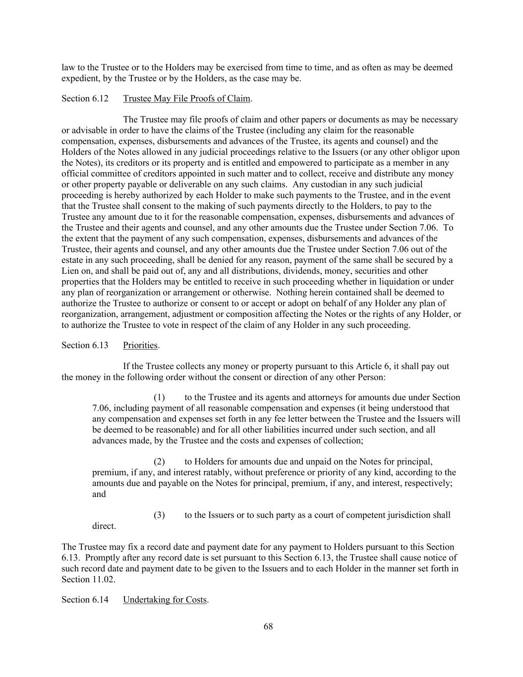 向受托人或持有人发出的68条法律,可由受托人或持有人(视属何情况而定)不时行使,并视认为合宜的情况而定。第6.12节受托人可以提出债权证明。受托人可提交必要或可取的债权证明和其他文件或文件,以便在与发行人(或票据上的任何其他债务人)、其债权人或其财产相关的任何司法程序中允许受托人和票据持有人的债权(包括对受托人、其代理人和大律师的合理赔偿、开支、付款和垫款的任何债权),并有权并有权作为成员参加在该事项中指定的任何正式债权人委员会并收集,接收和分配任何此类索赔的应付或可交付的任何款项或其他财产。任何该等司法程序中的任何保管人均获各持有人特此授权向受托人支付该等款项,并在受托人须同意直接向持有人支付该等款项的情况下,向受托人支付因受托人及其代理人和大律师的合理补偿、开支、付款和垫款而应付的任何款项,以及根据第7.06条应付受托人的任何其他款项。如受托人、其代理人及大律师的任何该等补偿、开支、付款及垫款,以及受托人根据第7.06条在任何该等程序中应从遗产中支付的任何其他款项,须因任何理由而被拒绝,则该等款项的支付须以持有人在该程序中可能有权收取的任何及所有分派、股息、金钱、证券及其他财产的留置权作担保,并须以该等财产的任何及所有分派、股息、金钱、证券及其他财产(不论是在清盘或根据任何重组或安排计划或其他方式)支付。本条文所载的任何规定,不得当作授权受托人授权或同意或代表任何持有人接受或采纳任何影响票据或任何持有人权利的重组、安排、调整或组合计划,或授权受托人在任何该等程序中就任何持有人的债权进行表决。第6.13节优先事项。如受托人依据本条第6款收取任何款项或财产,则应在未经任何其他人同意或指示的情况下按以下顺序支付款项:(1)向受托人及其代理人和律师支付根据第7.06条应支付的款项,包括支付所有合理的补偿和费用(据了解,受托人与发行人之间的任何费用信函中规定的任何补偿和费用将被视为合理)以及根据该条承担的所有其他责任,以及所有垫款,(2)根据票据到期应付的本金、溢价(如有)及利息的金额,分别向发行人或向有管辖权的法院所指示的当事人,就票据到期应付的本金、溢价(如有)及利息按比例向持有人支付,不享有任何种类的优先权或优先权;及(3)向发行人或向有管辖权的法院所指示的当事人支付本金、溢价(如有)及利息。受托人可就依据本条第6.13条向持有人支付的任何款项订定记录日期及付款日期。受托人须在依据本条第6.13条设定任何纪录日期后,迅速安排按第11.02条所列方式向发行人及每名持有人发出有关该纪录日期及付款日期的通知。第6.14节费用承付。
