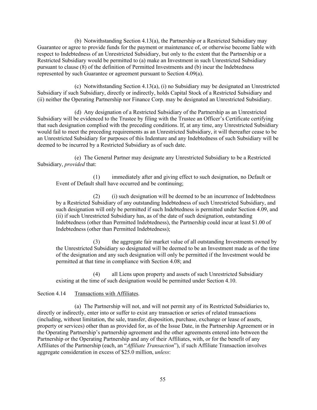 55(b)尽管有第4.13(a)节的规定,合伙企业或受限制的子公司可以担保或同意提供资金,用于支付或维持非受限制的子公司的债务,或以其他方式就其债务承担责任,但仅限于允许合伙企业或受限制的子公司(a)根据许可投资的定义第(8)条对该非受限制的子公司进行投资,以及(b)根据第4.09(a)节承担该担保或协议所代表的债务。(c)尽管有第4.13(a)条的规定,(i)任何附属公司如直接或间接持有受限制附属公司的股本,且(ii)经营合伙企业或财务公司均不得被指定为无限制附属公司,则不得将该附属公司指定为无限制附属公司。(d)将合伙企业的受限制附属公司指定为非受限制附属公司的任何行为,将通过向受托人提交证明该指定符合前述条件的高级职员证书而向受托人证明。如任何非受限制附属公司在任何时候将无法满足作为非受限制附属公司的前述规定,则其后就本契约而言,该附属公司将不再为非受限制附属公司,而该附属公司的任何债务将被视为自该日期起受限制附属公司所招致。(e)普通合伙人可指定任何非受限制的附属公司为受限制的附属公司,但条件是:(1)紧随该指定并使该指定生效后,不得发生任何违约或违约事件,且该事件仍在继续;(2)(i)该指定将被视为受限制的附属公司对该非受限制的附属公司的任何未偿债务产生债务,只有在根据第4.09条允许此类债务的情况下才允许此类指定,以及(ii)如果该非受限制的附属公司在该指定之日有未偿债务(允许的债务除外),合伙企业可能会产生至少1.00美元的债务(允许的债务除外);(3)如此指定的非限制性子公司拥有的所有未偿投资的总公允市场价值将被视为截至指定时作出的投资,只有在当时根据第4.08条允许投资的情况下,才允许进行任何此类指定;(4)根据第4.10条允许对在指定时存在的此类非限制性子公司的财产和资产的所有留置权。第4.14节与关联公司的交易。(a)合伙企业不会、也不会允许其任何受限制的附属公司直接或间接订立或容许存在任何交易或一系列相关交易(包括但不限于出售、转让、处分、购买、交换或租赁资产、财产或服务),但截至发行日期,合伙协议或经营合伙企业的合伙协议以及合伙企业或经营合伙企业与其任何关联企业之间订立的其他协议、与合伙企业的任何关联企业或为其利益而订立的协议或经营合伙企业的任何关联企业(每一项,“关联交易”),如果此类关联交易涉及的总对价超过2500万美元,除非: