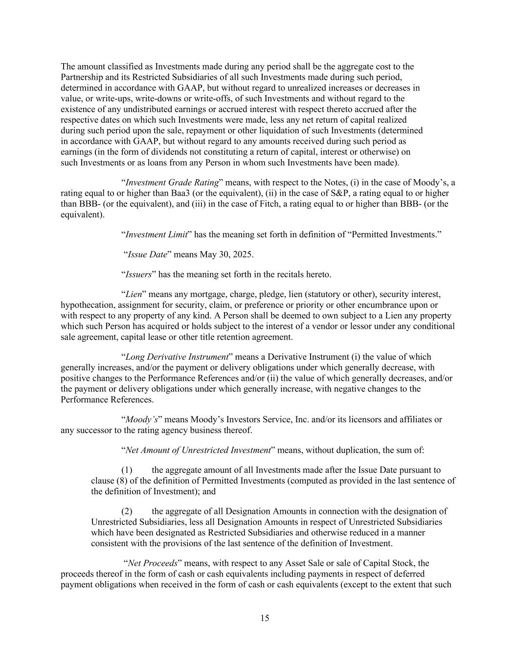 15在任何期间进行的归类为投资的金额应为根据公认会计原则确定的合伙企业及其受限子公司在该期间进行的所有此类投资的总成本,但不考虑此类投资的未实现价值增减或减记、减记或注销,也不考虑在进行此类投资的相应日期之后是否存在任何未分配收益或应计利息,减去出售时在该期间实现的任何资本净回报,此类投资的偿还或其他清算(根据公认会计原则确定,但不考虑在此期间收到的任何金额,如此类投资的收益(以不构成资本、利息或其他回报的股息形式)或作为来自进行此类投资的任何人的贷款)。“投资级评级”就票据而言是指,(i)在穆迪的情况下,评级等于或高于Baa3(或同等评级),(ii)在标普的情况下,评级等于或高于BBB-(或同等评级),以及(iii)在惠誉的情况下,评级等于或高于BBB-(或同等评级)。“投资限额”具有“许可投资”定义中规定的含义。“发行日”是指2025年5月30日。“发行人”的含义在本协议的独奏会中阐述。“留置权”是指任何抵押、押记、质押、留置权(法定或其他)、担保权益、质押、转让担保、债权或任何种类财产上或与之相关的优先权或优先权或其他产权负担。根据任何有条件出售协议、资本租赁或其他所有权保留协议,任何人须被视为在留置权的规限下拥有该人在卖方或出租人利益的规限下取得或持有的任何财产。“多头衍生工具”是指(i)价值普遍增加的衍生工具,和/或根据其承担的付款或交付义务普遍减少,业绩参考发生积极变化和/或(ii)其价值普遍减少,和/或根据其承担的付款或交付义务普遍增加,业绩参考发生消极变化的衍生工具。“穆迪”指Moody’s Investors Service,Inc.和/或其许可方和关联公司或其评级机构业务的任何继承者。“非限制性投资净额”是指,不重复:(1)根据许可投资定义第(8)条在发行日之后进行的所有投资的总额(按投资定义最后一句规定计算);(2)与指定非限制性子公司有关的所有指定金额的总和,减去已被指定为限制性子公司并以符合投资定义最后一句规定的方式减少的有关非限制性子公司的所有指定金额。“所得款项净额”是指,就任何资产出售或出售股本而言,以现金或现金等价物形式包括以现金或现金等价物形式收到的与递延付款义务有关的付款的所得款项(除非该等
