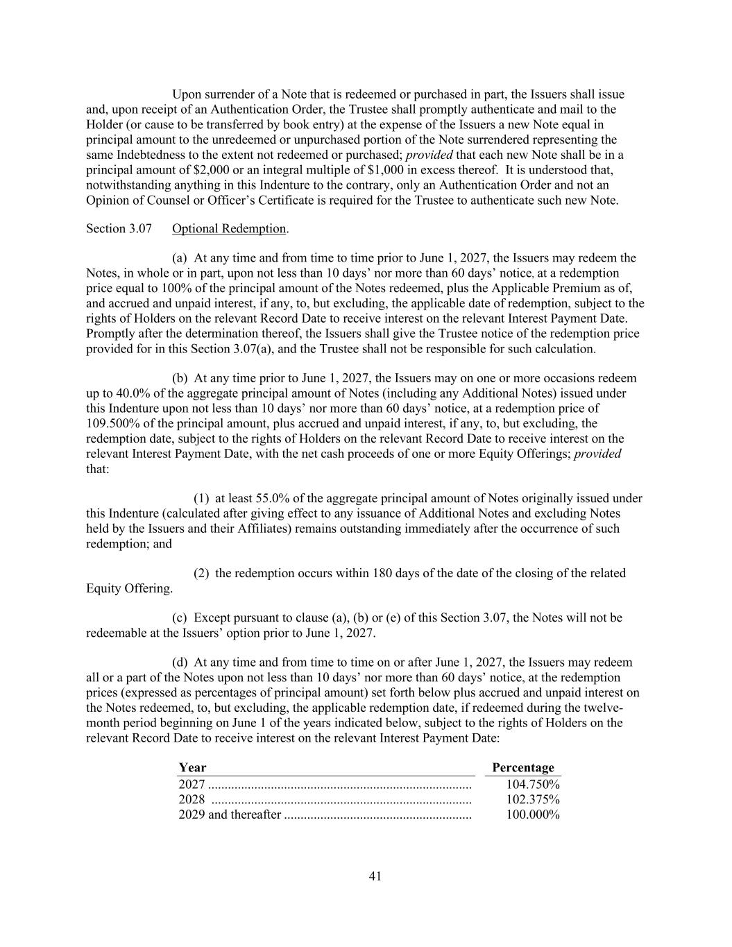 41在交出已部分赎回或购买的票据后,发行人应发行并在收到认证令后,受托人应迅速认证并邮寄给持有人(或促使以簿记方式转让)一张本金等于在未赎回或购买的范围内代表相同债务的已交出票据的未赎回或未购买部分的新票据;但每份新票据的本金金额应为2000美元或超过其1,000美元的整数倍。据了解,尽管本指引中有任何相反的规定,受托人认证该新票据只需要认证令而非大律师或高级人员证书的意见。第3.07节可选赎回。(a)在2027年6月1日之前的任何时间及不时,发行人可在发出不少于10天或不多于60天的通知后,按赎回价格全部或部分赎回票据,赎回价格相等于已赎回票据本金额的100%,加上截至适用赎回日期的适用溢价,以及截至但不包括适用赎回日期的应计及未付利息(如有),但有关纪录日期的持有人有权在有关付息日收取利息。发行人应在确定后迅速将本条第3.07(a)款规定的赎回价格通知受托人,受托人无须负责计算。(b)在2027年6月1日之前的任何时间,发行人可在不少于10天或不多于60天的通知下,在一次或多次赎回根据本义齿发行的票据(包括任何附加票据)本金总额的最多40.0%,赎回价格为本金的109.500%,加上应计及未付利息(如有)至(但不包括)赎回日,但有关记录日期的持有人有权在有关付息日收取利息,与一项或多项股权发售的现金所得款项净额;但条件是:(1)在紧接该等赎回发生后,最初根据本契约发行的票据本金总额(在任何额外票据发行生效后计算,但不包括发行人及其关联公司持有的票据)的至少55.0%仍未偿还;及(2)赎回发生在相关股权发售结束之日起180天内。(c)除依据本条第3.07条(a)、(b)或(e)款外,票据将不会在2027年6月1日前由发行人选择赎回。(d)在2027年6月1日或之后的任何时间及不时,发行人可在发出不少于10天或不多于60天的通知后,按下述赎回价格(以本金百分比表示)加上已赎回票据的应计及未付利息赎回全部或部分票据,直至(但不包括)适用的赎回日期,如在下述各年度的6月1日开始的十二个月期间内赎回,受有关记录日期持有人于有关付息日收取利息的权利:2027年百分比.................................................................... 104.750% 2028年.................................................... 10 2.375% 2029年及其后.................................................... 10 0.000%