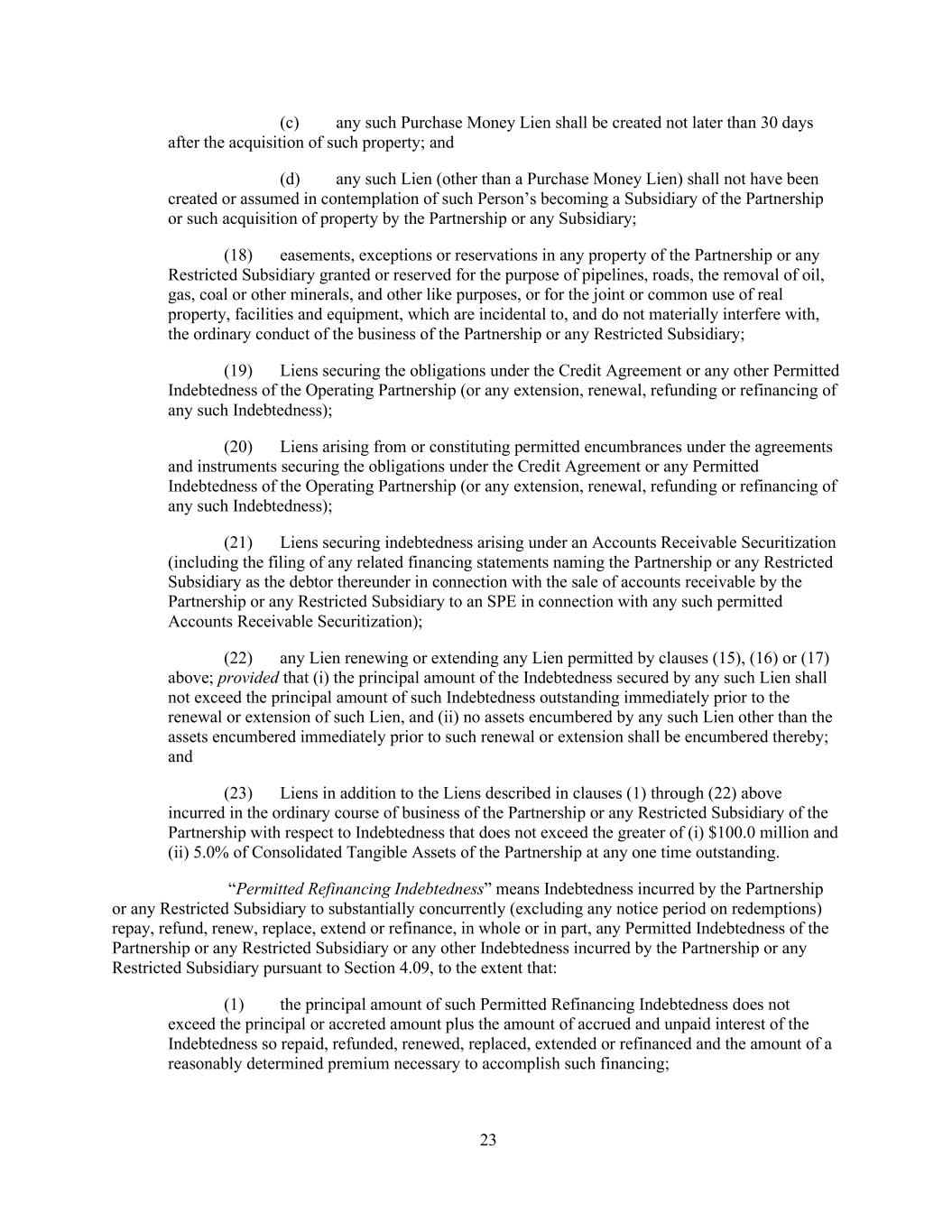 23(c)任何该等购买款项留置权应在不迟于取得该等财产后30天内设定;(d)任何该等留置权(购买款项留置权除外)不得在考虑该人成为合伙企业的附属公司或合伙企业或任何附属公司取得该等财产时设定或承担;(18)合伙企业或为管道、道路、清除石油、天然气、煤炭或其他矿物以及其他类似目的而授予或保留的任何受限制附属公司的任何财产中的地役权、例外情况或保留,或为共同或共同使用不动产、设施和设备,这些是合伙企业或任何受限制的子公司业务的正常开展所附带的,且不构成实质性干扰;(19)为信贷协议项下的义务或经营合伙企业的任何其他许可债务提供担保的留置权(或任何此类债务的任何延期、展期、退款或再融资);(20)为信贷协议项下的义务或经营合伙企业的任何许可债务提供担保的协议和票据项下产生或构成许可产权负担的留置权(或任何延期、展期、任何此类债务的退款或再融资);(21)为应收账款证券化下产生的债务提供担保的留置权(包括就合伙企业或任何受限制子公司就任何此类允许的应收账款证券化向SPE出售应收账款而将合伙企业或任何受限制子公司指定为其项下债务人的任何相关融资报表的提交);(22)任何延续或延长第(15)条允许的任何留置权的留置权,(16)或(17)以上;但(i)任何该等留置权所担保的债项的本金额不得超过紧接该等留置权续期或延期前该等未偿还债项的本金额,(ii)除紧接续期或展期前作保的资产外,任何由任何该等留置权作保的资产均不得因此作保;及(23)除上文第(1)至(22)条所述留置权外,在合伙企业或合伙企业的任何受限制附属公司的正常业务过程中就债务产生的留置权不超过(i)1亿美元和(ii)合伙企业在任何时间未偿还的合并有形资产的5.0%中的较高者。“准许再融资债务”是指合伙企业或任何受限制的附属公司因实质上同时(不包括任何赎回通知期)全部或部分偿还、退还、续期、替换、延长或再融资合伙企业或任何受限制的附属公司的任何准许债务或合伙企业或任何受限制的附属公司根据第4.09条所招致的任何其他债务而招致的债务,但以:(1)该等准许再融资债务的本金额不超过本金或增值金额加上如此偿还、退还、续期、置换的债务的应计未付利息金额为限,延长或再融资,以及完成此类融资所需的合理确定的溢价金额;