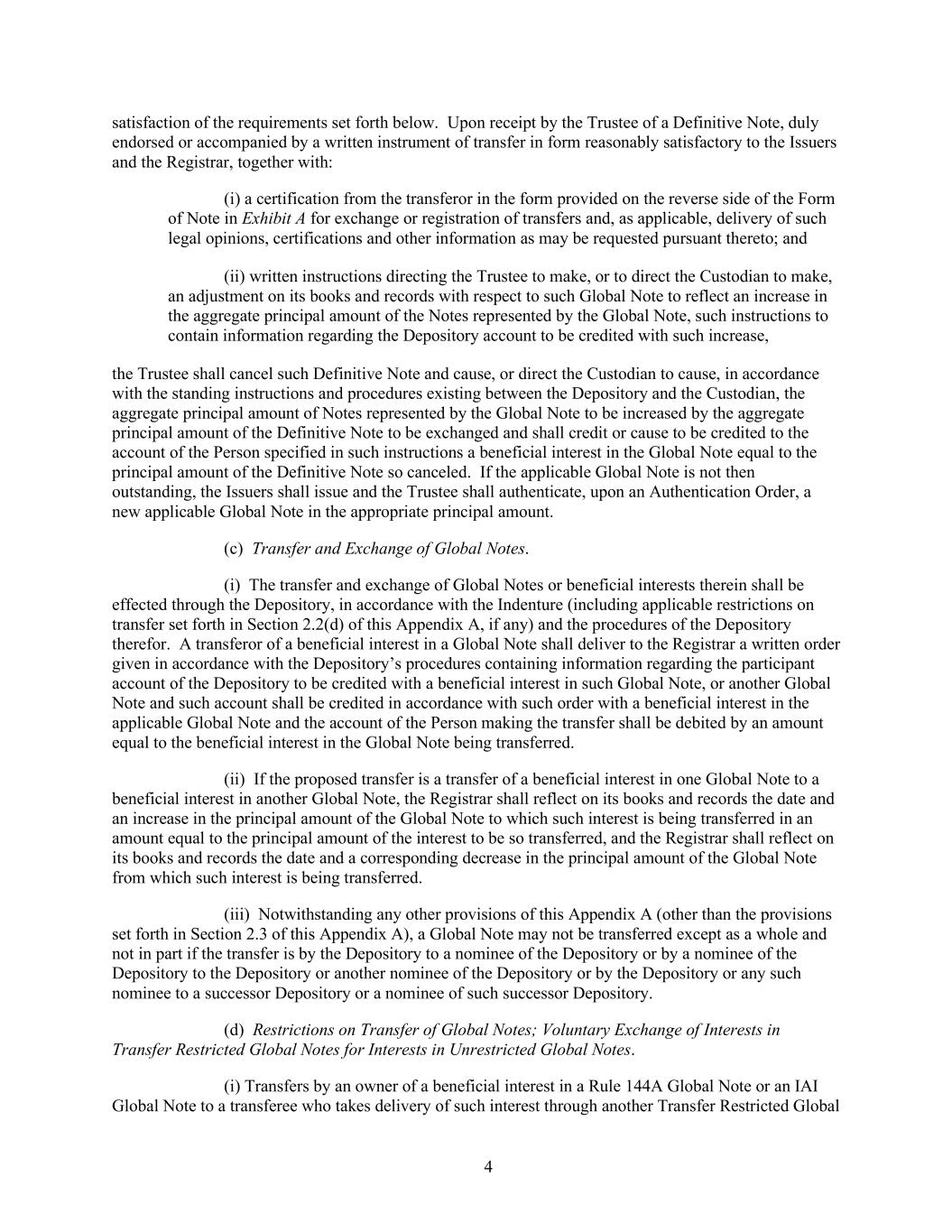 4满足下述要求。受托人在收到正式票据后,须妥为背书或附有发行人及注册处处长合理满意的格式的书面转让文书,并连同:(i)转让人就交换或登记转让而提供的证明,并(ii)指示受托人作出或指示托管人作出的书面指示,对其与该全球票据有关的账簿和记录进行调整,以反映全球票据所代表的票据本金总额的增加,如指示包含有关应记入该增加的存管账户的信息,则受托人应取消该确定票据,并根据存管人与托管人之间现有的常设指示和程序,促使或指示托管人促使,全球票据所代表的票据本金总额将增加拟交换的最终票据的本金总额,并应将全球票据的实益权益记入或促使记入该等指示中指定的人的账户,该权益等于如此注销的最终票据的本金金额。如果适用的全球票据当时未偿付,则发行人应根据认证令发行和受托人认证新的适用的全球票据,其本金金额适当。(c)全球票据的转让和交换。(i)全球票据或其中的实益权益的转让和交换应根据义齿(包括本附录A第2.2(d)节(如有)中规定的转让的适用限制)以及保存人的相关程序,通过保存人进行。全球票据实益权益的转让人应向书记官长交付一份按照保存人程序发出的书面命令,其中应载有关于将在该全球票据中享有实益权益记入贷方的保存人参与账户的信息,或另一全球票据,该账户应按照该命令记入适用的全球票据的实益权益,进行转让的人的账户应借记与所转让的全球票据的实益权益相等的金额。(ii)如建议的转让是将一张全球票据的实益权益转让给另一张全球票据的实益权益,则书记官长应在其簿册上反映该权益被转让给的全球票据的日期和本金金额的增加,数额等于将如此转让的利息的本金金额,而书记官长应在其簿册上反映并记录该权益被转让的全球票据的日期和本金金额的相应减少。(iii)尽管有本附录A的任何其他规定(本附录A第2.3节的规定除外),全球票据不得转让,除非是整体而非部分转让,如果转让是由保存人转让给保存人的代名人,或由保存人的代名人转让给保存人或保存人的另一代名人,或由保存人或任何该等代名人转让给继任保存人或该继任保存人的代名人。(d)对全球票据转让的限制;自愿将转让受限制全球票据的权益交换为不受限制全球票据的权益。(i)第144A条规则的全球票据或IAI全球票据的实益权益所有人通过另一转让受限制的全球向接收该权益的受让人进行转让