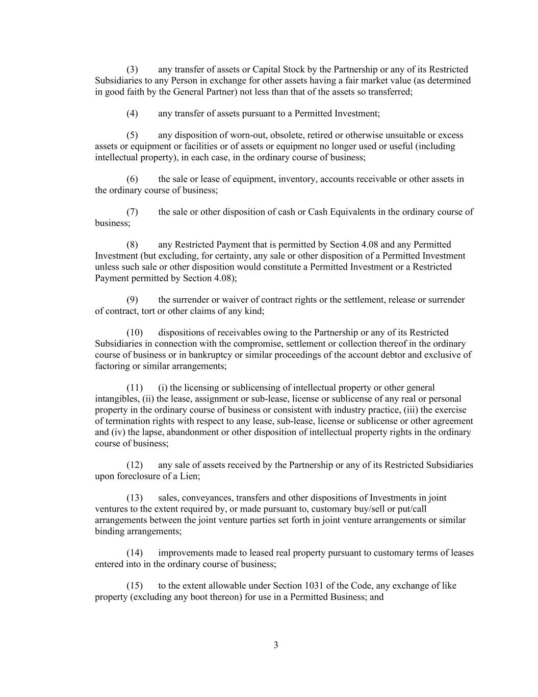 3(3)合伙企业或其任何受限制子公司向任何人转让资产或股本,以换取其他具有公平市场价值(由普通合伙人善意确定)不低于如此转让的资产的资产;(4)根据许可投资进行的任何资产转让;(5)对破旧、过时、退役或其他不合适或多余的资产或设备或设施或不再使用或有用的资产或设备(包括知识产权)的任何处置,在每种情况下,在正常经营过程中;(6)在正常经营过程中出售或租赁设备、存货、应收账款或其他资产;(7)在正常经营过程中出售或以其他方式处置现金或现金等价物;(8)第4.08条允许的任何限制性付款和任何许可投资(但为确定起见,不包括许可投资的任何出售或其他处置,除非此类出售或其他处置将构成许可投资或第4.08条允许的限制性付款);(9)放弃或放弃合同权利或和解,解除或放弃任何种类的合同、侵权或其他债权;(10)在正常业务过程中或在账户债务人的破产或类似程序中处置因妥协、结算或收取而欠合伙企业或其任何受限制子公司的应收款,但不包括保理或类似安排;(11)(i)知识产权或其他一般无形资产的许可或转许可,(ii)在正常业务过程中或符合行业惯例的任何不动产或个人财产的租赁、转让或转租赁、许可或转许可,(iii)就任何租赁、转租、许可或转许可或其他协议行使终止权,以及(iv)知识产权在正常经营过程中失效、放弃或以其他方式处分;(12)合伙企业或其任何受限制子公司在取消留置权时收到的任何资产出售;(13)在要求或依据要求的范围内出售、转让、转让和对合资企业投资的其他处分,合营企业安排或类似约束性安排中规定的合营企业双方之间的惯常买入/卖出或卖出/卖出安排;(14)根据在正常经营过程中订立的惯常租赁条款对租赁不动产作出的改进;(15)在《守则》第1031条允许的范围内,为在许可业务中使用而进行的任何类似财产交换(不包括其上的任何靴子);和