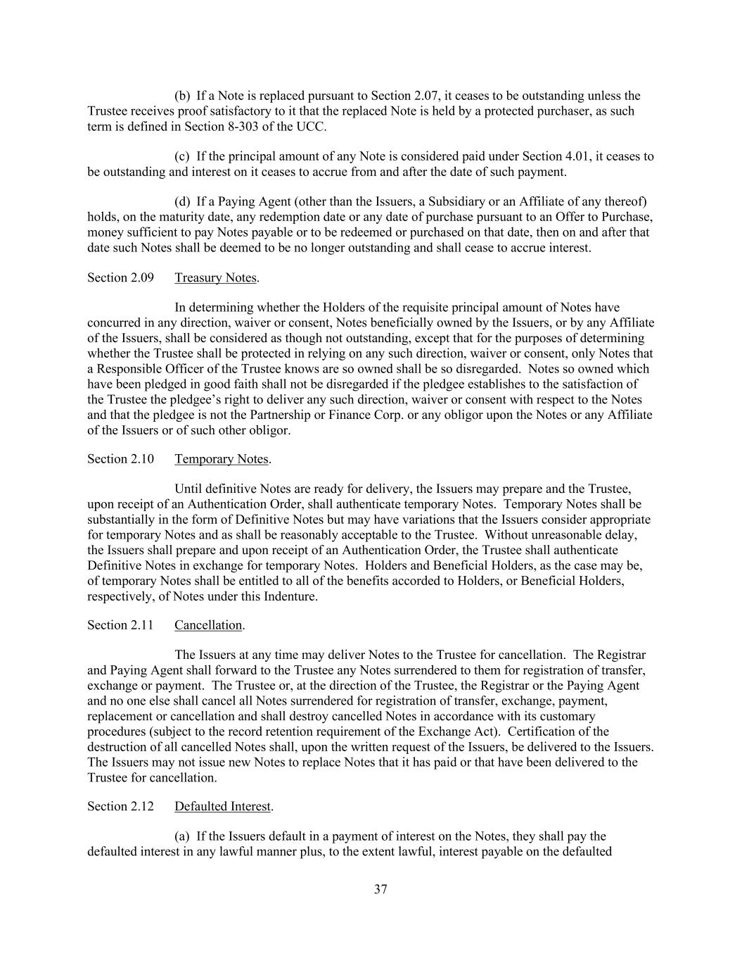 37(b)如果票据根据第2.07条被替换,则该票据不再未清偿,除非受托人收到令其满意的证明,证明所替换的票据由受保护的购买者持有,该术语在UCC第8-303条中定义。(c)如任何票据的本金额被视为根据第4.01条已支付,则该票据不再未偿还,而该票据的利息亦自该付款日期及之后停止累积。(d)如付款代理人(发行人、附属公司或其任何附属公司除外)在到期日、任何赎回日期或依据购买要约的任何购买日期持有足以支付该日期应付票据或将被赎回或购买的款项,则在该日期及之后,该等票据将被视为不再未偿还,并应停止产生利息。第2.09款国库券。在确定所需本金额票据的持有人是否已同意任何指示、放弃或同意时,由发行人或发行人的任何关联公司实益拥有的票据,应被视为如同未偿付,但为确定受托人是否应在依赖任何此类指示、放弃或同意时受到保护,只有受托人的负责人员知道如此拥有的票据才应被如此忽略。如质权人确立质权人就票据交付任何该等指示、放弃或同意的权利令受托人信纳,且质权人并非合伙企业或财务公司或票据上的任何债务人或发行人的任何关联公司或该等其他债务人的任何债务人,则如此拥有的已善意质押的票据不得被置之不理。第2.10节临时说明。在最终票据准备交付之前,发行人可以准备,受托人在收到认证令后,应对临时票据进行认证。临时票据应基本上采用确定票据的形式,但可能具有发行人认为适合临时票据并应为受托人合理接受的变体。不得无理拖延,发行人应准备并在收到认证令后,受托人应认证最终票据以换取临时票据。临时票据的持有人及实益持有人(视属何情况而定)有权分别享有根据本契约给予票据持有人或实益持有人的所有利益。第2.11节取消。发行人可随时将票据交付受托人注销。书记官长及付款代理人须将任何交回予其登记转让、交换或付款的票据转交受托人。受托人或在受托人的指示下,书记官长或付款代理人及任何其他人不得取消所有为登记转让、交换、付款、替换或注销而交出的票据,并应按照其惯常程序(以《交易法》的记录保留要求为准)销毁已注销的票据。所有已注销票据的销毁证明,应经发行人书面请求,送达发行人。发行人不得发行新的票据以取代其已支付或已交付受托人注销的票据。第2.12节违约利息。(a)如发行人未能支付票据的利息,则他们须以任何合法方式支付违约利息,并在合法范围内加上就违约应付的利息