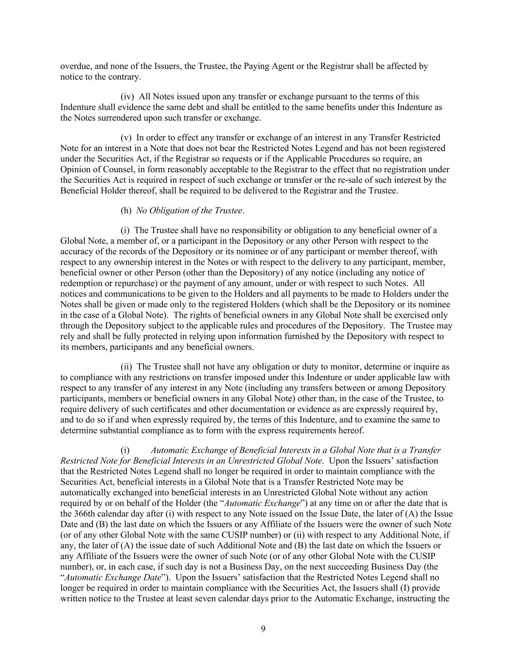逾期9笔,且发行人、受托人、付款代理人或登记官均不受相反通知的影响。(iv)根据本义齿的条款在任何转让或交换时发行的所有票据应证明与在此类转让或交换时交出的票据相同的债务,并有权根据本义齿享有相同的利益。(v)为将任何转让受限制票据的权益进行任何转让或交换,以换取不带有受限制票据图例且未根据《证券法》进行登记的票据的权益,如书记官长提出要求或适用程序有此要求,则提交一份律师意见,其形式为书记官长合理接受,大意为无需根据《证券法》就此类交换或转让进行登记,或由其受益人重新出售此类权益,须交付司法常务官及受托人。(h)没有受托人的义务。(i)受托人对全球票据的任何实益拥有人、存管人的成员、或存管人的参与者或任何其他人的记录的准确性、对票据的任何所有权权益或对向任何参与者、成员、实益拥有人或其他人(存管人除外)交付任何通知(包括任何赎回或回购通知)或支付任何金额不承担任何责任或义务,根据或与该等票据有关。根据票据须向持有人发出的所有通知及通讯,以及须向持有人作出的所有付款,均须只向登记持有人(如属全球票据,则须为存管人或其代名人)发出或作出。任何全球票据的受益所有人的权利应仅通过保存人行使,但须遵守保存人的适用规则和程序。受托人在依赖存管人就其成员、参与者和任何受益所有人提供的信息时,可以依赖并应得到充分保护。(ii)受托人没有任何义务或义务监测、确定或查询根据本契约或根据适用法律就任何票据的任何权益转让(包括任何全球票据的存管参与人、成员或实益拥有人之间或之间的任何转让)施加的任何转让限制的遵守情况,但如属受托人,则要求交付本契约条款明确要求的证书和其他文件或证据,并在本契约条款明确要求的情况下这样做,并对其进行审查,以确定实质上符合本协议的明示要求。(i)全球票据中的受益权益自动交换,该全球票据是非限制性全球票据中的受益权益的转让受限票据。在发行人信纳为保持遵守《证券法》而不再需要受限制票据传奇后,作为转让受限制票据的全球票据的实益权益可自动交换为无限制全球票据的实益权益,而无须持有人或其代表在任何时间就发行日期发行的任何票据采取任何行动(i)后第366个日历日或之后的任何时间(“自动交换”),(a)发行日期及(b)发行人或发行人的任何关联公司为该等票据(或任何其他具有相同CUSIP编号的全球票据)的拥有人的最后日期,或(ii)就任何附加票据(如有)而言,(a)该等附加票据的发行日期及(b)发行人或发行人的任何关联公司为该等票据(或任何其他具有CUSIP编号的全球票据)的拥有人的最后日期两者中较晚者,或在每种情况下,如果该日不是营业日,则在下一个营业日(“自动兑换日”)。在发行人信纳为保持遵守《证券法》而不再需要受限制票据传奇后,发行人应(i)在自动交易所至少七个日历日前向受托人提供书面通知,指示