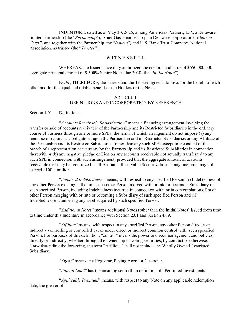 1份契约,日期为2025年5月30日,由特拉华州有限合伙企业AmeriGas Partners,L.P.(“合伙企业”)、特拉华州公司AmeriGas Finance Corp.(“Finance Corp.”)以及合伙企业“发行人”)和作为受托人的美国银行信托公司National Association(“受托人”)签署。鉴于发行人已正式授权创设和发行本金总额550,000,000美元、于2030年到期的9.500%优先票据(“初始票据”)。因此,发行人和受托人为了彼此的利益以及为了票据持有人的平等和可予评定的利益,同意如下。第1条定义和纳入参照第1.01节定义。“应收账款证券化”是指在正常经营过程中通过一个或多个SPE转让或出售合伙企业及其受限子公司的应收账款的融资安排,该安排的条款不对合伙企业及其受限子公司或合伙企业及其受限子公司的任何关联公司(任何此类SPE除外)施加(a)任何追索或回购义务,但合伙企业及其受限子公司违反与此相关的陈述或保证的情况除外,或(b)就与该安排相关的未实际转移至任何此类SPE的任何应收账款的任何负质押或留置权;但应收账款总额可在任何时候在所有应收账款证券化中证券化的金额不得超过1亿美元。“获得的债务”就任何特定人士而言是指(i)在该其他人与该特定人士合并或并入或成为该特定人士的附属公司时存在的任何其他人的债务,包括因该其他人与该特定人士合并或并入或成为该特定人士的附属公司而产生或在考虑中产生的债务,以及(ii)以该特定人士获得的任何资产作抵押的债务。“附加票据”是指根据第2.01节和第4.09节根据本契约不时发行的附加票据(初始票据除外)。“关联关系”是指,就任何特定人员而言,任何其他人员直接或间接控制或受该特定人员控制,或与该特定人员处于直接或间接共同控制之下。就本定义而言,“控制”是指直接或间接地指导管理层和政策的权力,无论是通过投票证券的所有权、通过合同或其他方式。尽管有上述规定,“附属公司”一词不应包括任何全资受限制的附属公司。“代理人”是指任何注册商、付款代理人或托管人。“年度限额”具有“许可投资”定义中规定的含义。“适用溢价”是指,就任何适用赎回日期的任何票据而言,以下两者中的较大者: