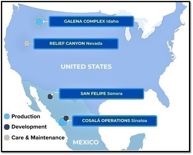 该公司是一家以白银为重点的生产商,在世界主要的银矿地区拥有两个业务:美国爱达荷州的Galena Complex和墨西哥锡那罗亚州的Cosal á业务。该公司还拥有Relief Canyon矿(“Relief Canyon”),目前正在美国内华达州进行维护和保养。