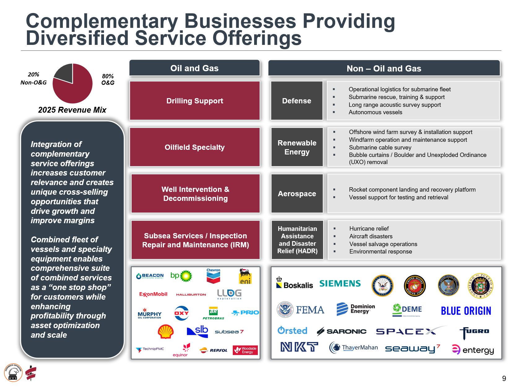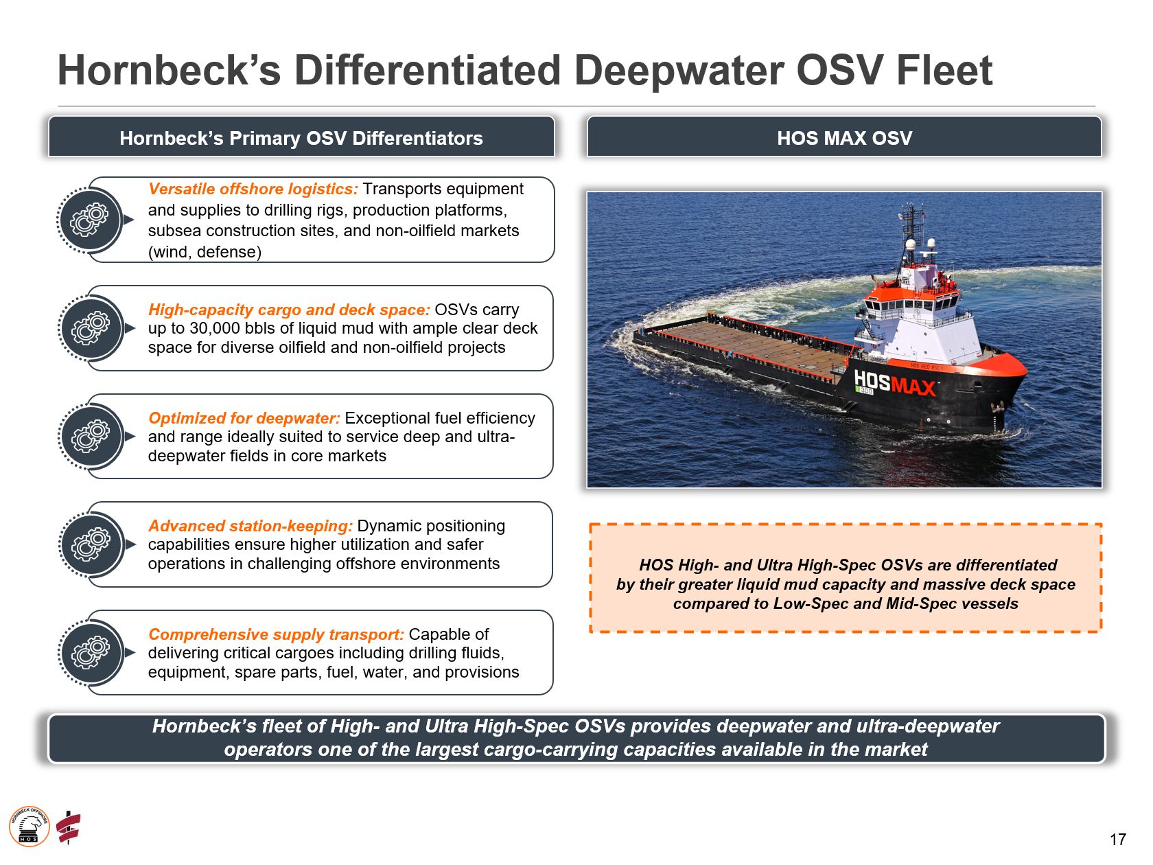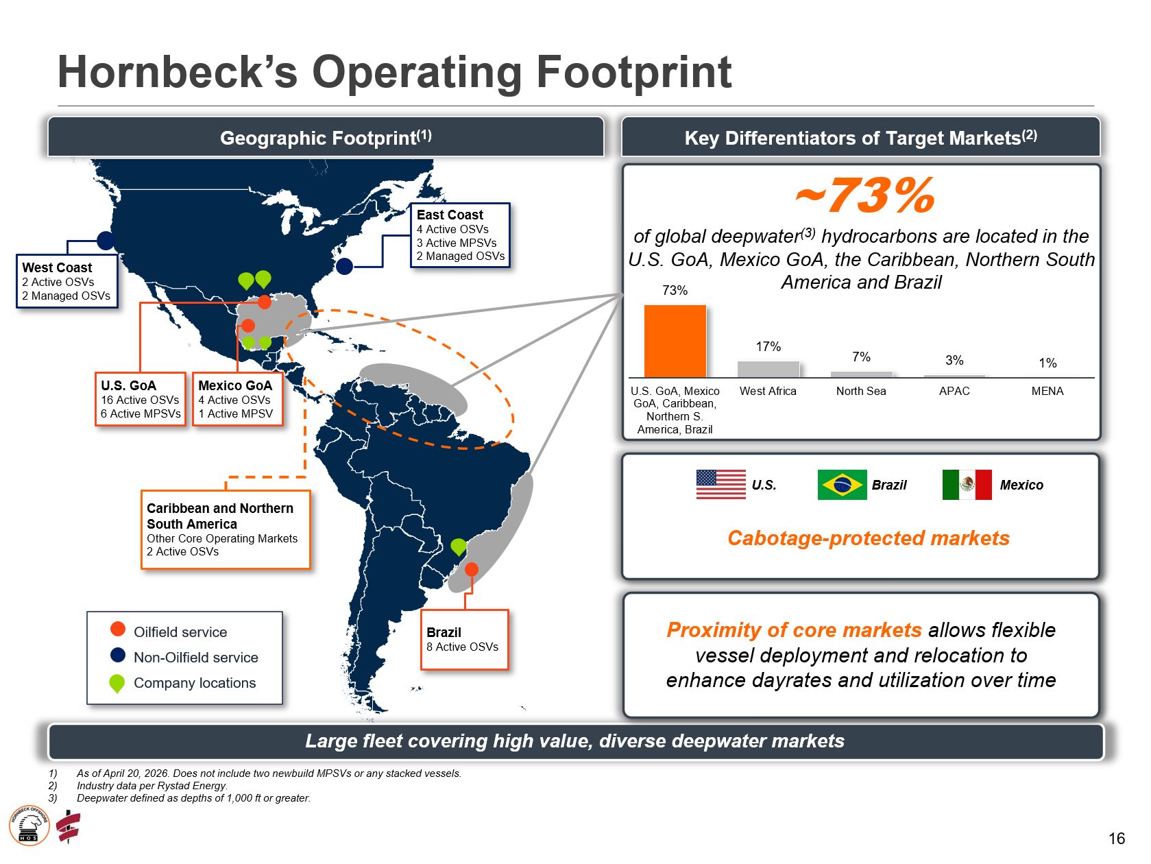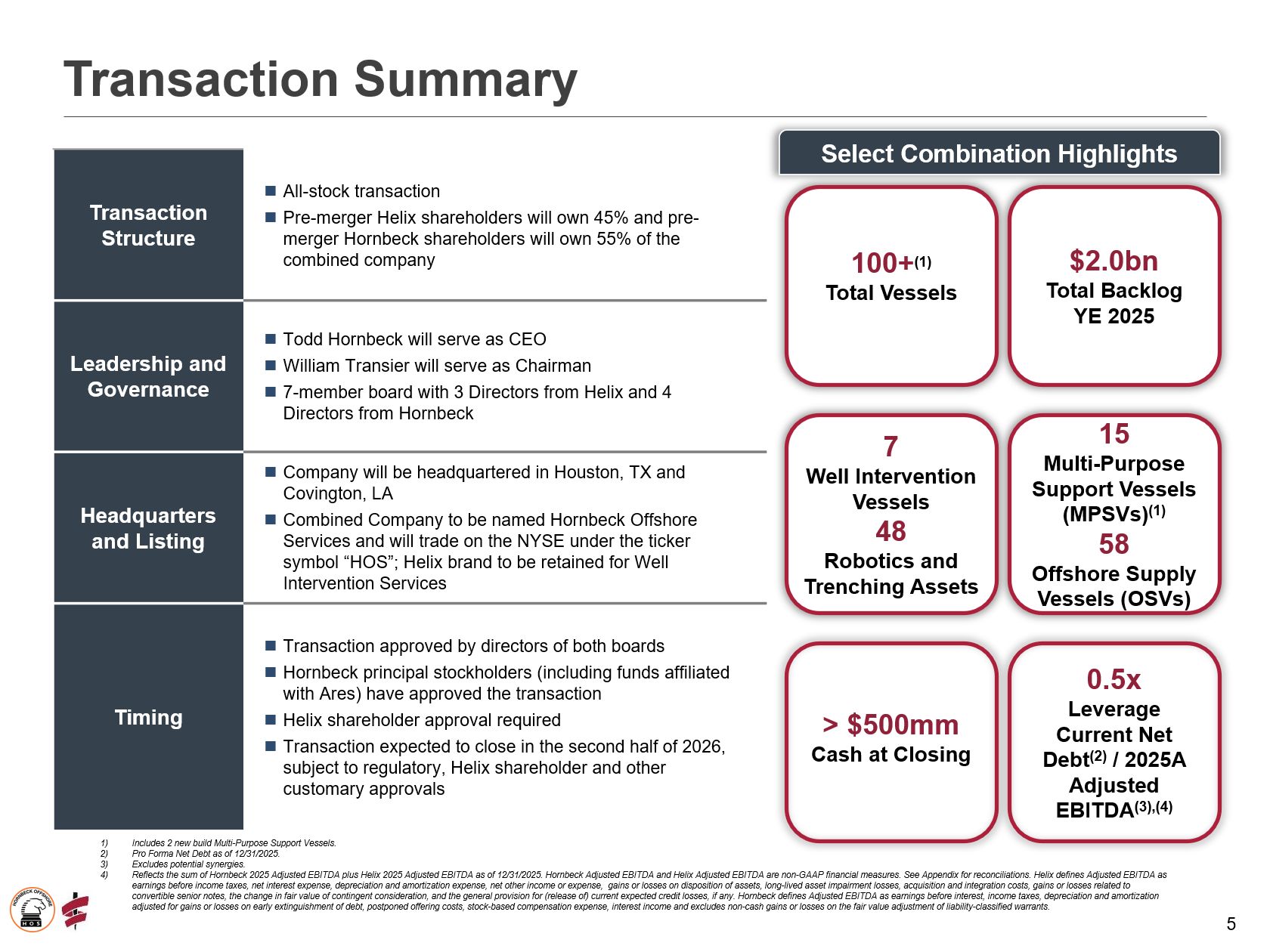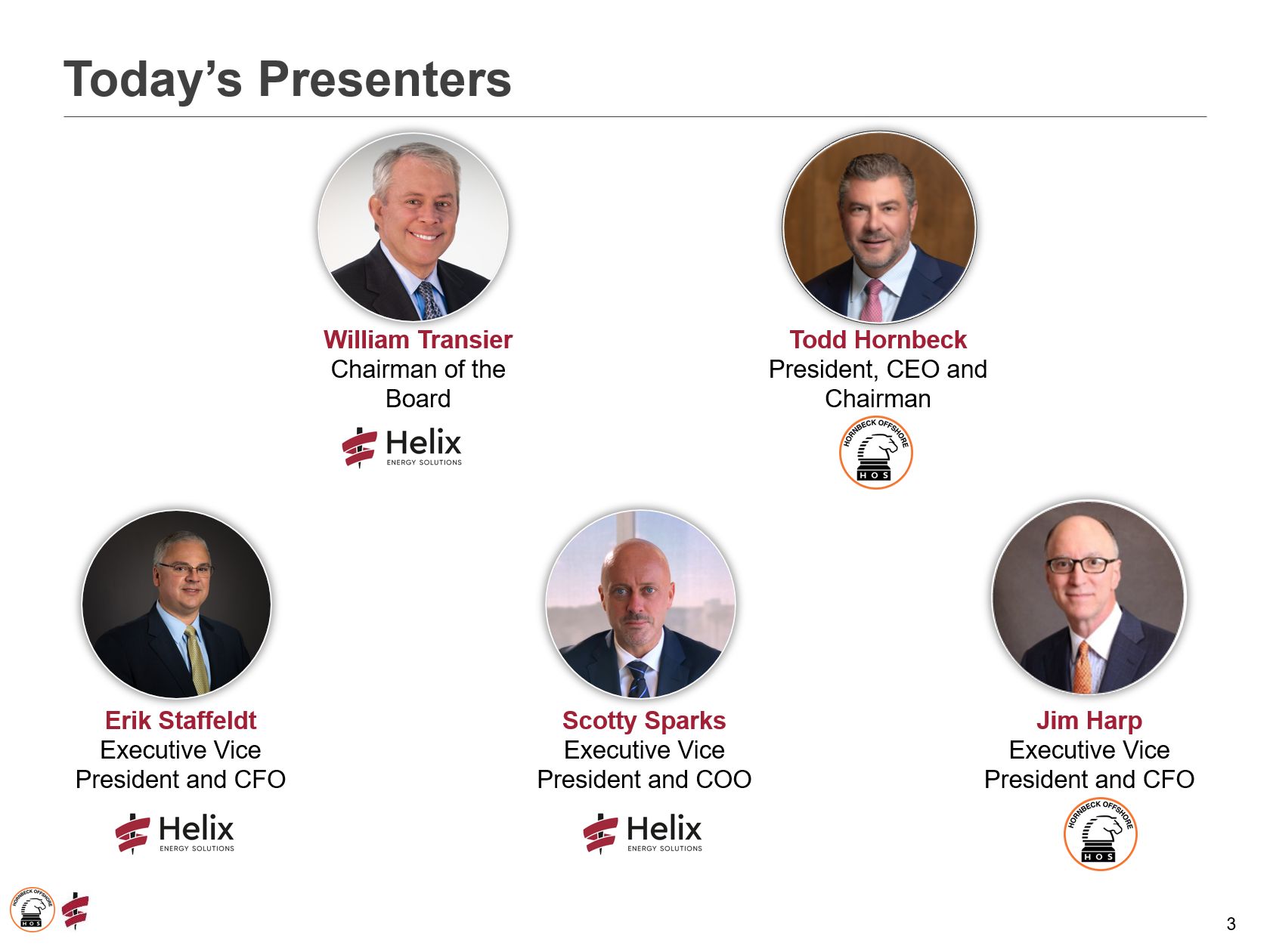 免责声明前瞻性陈述本演示文稿包含前瞻性陈述。除本演示文稿中包含的现在或历史事实陈述外,所有关于Helix Energy Solutions Group, Inc.(“Helix”)与Hornbeck Offshore Services, Inc.(“Hornbeck”)拟议合并、Helix完成交易的能力、交易的好处和合并后公司的未来财务业绩,以及合并后公司的战略、未来运营、估计财务状况、估计收入和亏损、估计协同效应、预计成本、前景、计划和管理目标的陈述均为前瞻性陈述。这些陈述基于当前的预期和假设,并受到可能导致实际结果出现重大差异的风险和不确定性的影响。“预期”、“相信”、“预期”、“打算”、“可能”、“计划”、“项目”、“应该”、“将”等词语和类似表述旨在识别前瞻性陈述,但并非所有前瞻性陈述都包含这些识别词语,没有这些词语并不意味着一份陈述不具有前瞻性。此类前瞻性陈述包括但不限于以下方面的陈述:Helix和Hornbeck对按预期条款和时间完成拟议交易的预期、希望、信念、意图或战略,或根本没有,包括获得监管机构和股东的批准,以及对完成拟议交易的其他条件的满足;实现拟议交易预期收益的时间表和能力(包括预期的协同效应和资产负债表余额);以及合并后公司的治理。这些前瞻性陈述主要基于Helix和Hornbeck目前的预期。这些前瞻性陈述涉及已知和未知的风险、不确定性和其他重要因素,可能导致Helix或Hornbeck的实际结果、业绩或成就与前瞻性陈述明示或暗示的任何未来结果、业绩或成就存在重大差异,包括但不限于与拟议交易相关的潜在诉讼相关的风险,包括与之相关的任何结果的影响;拟议交易的中断(包括某些客户在控制权发生变更时终止或修改合同的能力)将损害Helix或Hornbeck的业务的风险,包括当前的计划和运营,包括在拟议交易待决期间;Helix或Hornbeck留住和雇用关键人员、留住客户或与其各自的供应商和客户保持关系的能力;将管理层的时间和注意力从普通课程业务运营转移到完成拟议交易;因宣布或完成拟议交易而对业务关系产生的潜在不利反应或变化;立法、监管和经济发展;潜在的业务不确定性,包括现有业务关系的变化,在可能影响Helix或Hornbeck的财务业绩以及不可预见的负债、未来资本支出、收入、费用、收益、协同效应、经济表现、债务、财务状况、亏损、未来前景、业务和管理战略、Helix或Hornbeck业务的扩张和增长的拟议交易未决期间;Helix和Hornbeck无法从交易中实现预期的协同效应,或实现这些协同效应可能需要比预期更长的时间或更高的成本;无法在预期的时间线上去杠杆,或根本没有;对任何必要的政府和监管批准施加任何条款和条件,这可能会降低收购对Helix和Hornbeck的预期收益;无法在没有意外成本或延迟的情况下成功地将Hornbeck的业务与Helix的业务整合;拟议交易待决期间的某些限制可能会影响Helix或Hornbeck寻求某些商业机会或战略交易的能力;拟议交易完成的成本可能比预期的更高,包括由于意外因素或事件;任何事件的发生,可能导致拟议交易终止的变化或其他情况,包括需要Helix或Hornbeck支付终止费和费用补偿的情况;如果拟议交易未能完成,Helix或Hornbeck股价可能大幅下跌的风险;此时可能存在未知、可能或无法估计的负债或意外成本, 收费或开支;政府、监管当局、客户、供应商和合作伙伴的行动;市场状况;收购物业的结果;对服务的需求;供应商、客户和合作伙伴履行合同;经营危险和延误,其中包括延迟交付、租用或客户接受资产或其接受条款;实现当前积压的最终能力;员工管理问题;全球政治和经济发展的复杂性;地质风险;石油和天然气价格的波动以及Helix向美国证券交易委员会(“SEC”)提交的文件中不时描述的其他风险。此外,Helix和Hornbeck提醒您,本演示文稿中包含的前瞻性陈述受以下因素的影响:(i)可能会延迟拟议交易或导致相关协议终止的任何事件、变化或其他情况的发生;(ii)在拟议交易公布后可能对Helix或Hornbeck提起的任何法律诉讼的结果;(iii)由于未能获得Helix或Hornbeck股东的批准而无法完成拟议交易,或合并协议中达成交易的其他条件;(iv)拟议交易因宣布拟议交易而扰乱Helix或Hornbeck当前计划和运营的风险;(v)Helix和Hornbeck实现拟议交易的预期收益的能力,这可能会受到(其中包括)竞争以及Helix和Hornbeck在拟议交易后以盈利方式增长和管理增长的能力的影响;(vi)与拟议交易相关的成本。本演示文稿中的前瞻性陈述基于Helix和Hornbeck截至本演示文稿发布之日可获得的信息,尽管Helix和Hornbeck认为这些信息构成了此类陈述的合理基础,但这些陈述本质上是不确定的,请注意不要过度依赖这些陈述。除适用法律要求外,Helix和Hornbeck不计划公开更新或修改本演示文稿中包含的任何前瞻性陈述,无论是由于任何新信息、未来事件或其他原因。有关可能影响本文讨论的运营和预测的这些因素和其他因素的更多信息,可以在Helix向SEC提交的定期文件中找到,包括Helix截至2025年12月31日的财政年度的10-K表格年度报告、Helix随后提交的10-Q表格季度报告和S-4表格季度报告。Helix提交给SEC的文件可在SEC网站www.sec.gov上公开查阅。此次征集的参与者Helix及其某些董事和执行官以及Hornbeck及其某些董事和执行官,可被视为根据SEC规则就拟议交易向Helix股东(“Helix股东”)征集代理的参与者。通过阅读Helix于2026年2月26日向SEC提交的截至2025年12月31日的财政年度的10-K表