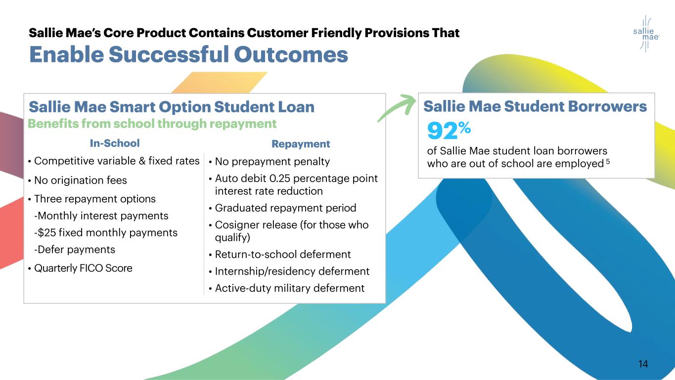 13 Expanding Addressable Market • Private Education Loans represent 2-3% of the overall spend in higher education annually. • Total spend on higher education grows ~2% annually, while Sallie Mae Private Education Loans growth expanded from 4% - 10% from 2021 to 2022, increasing private education loan market share by 90bps. Strong Strategic Execution • Over the past 8 years, the 25–29-year-old population with a bachelor’s degree or higher has increased an average of 0.6% per year.15 • 55% of students graduated with student loans in AY 2020-202114 • Of the 55% of bachelor's degree recipients that graduated with student loans, the average debt amount was $29,400. 14 Higher Education is Valuable • The median income of recent college graduates was $52,000 in 2021, 73% higher than the median income of people with high school diploma only.16 Higher Education Value Proposition Remains Attractive4 Total $483B Private Education Loans $11BOther $12B Federal Loans $79B Grants $140B Higher Education Spend (Academic Year 2021-2022) Family Contribution $241B