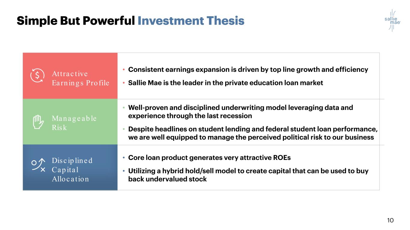 10 Simple But Powerful Investment Thesis • Consistent earnings expansion is driven by top line growth and efficiency • Sallie Mae is the leader in the private education loan market • Well-proven and disciplined underwriting model leveraging data and experience through the last recession • Despite headlines on student lending and federal student loan performance, we are well equipped to manage the perceived political risk to our business • Core loan product generates very attractive ROEs • Utilizing a hybrid hold/sell model to create capital that can be used to buy back undervalued stock Attrac t ive Earn ing s Profile Manag e ab le Risk Disc ip line d Cap ita l Alloc a t ion