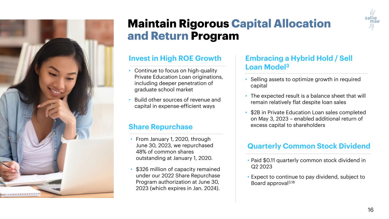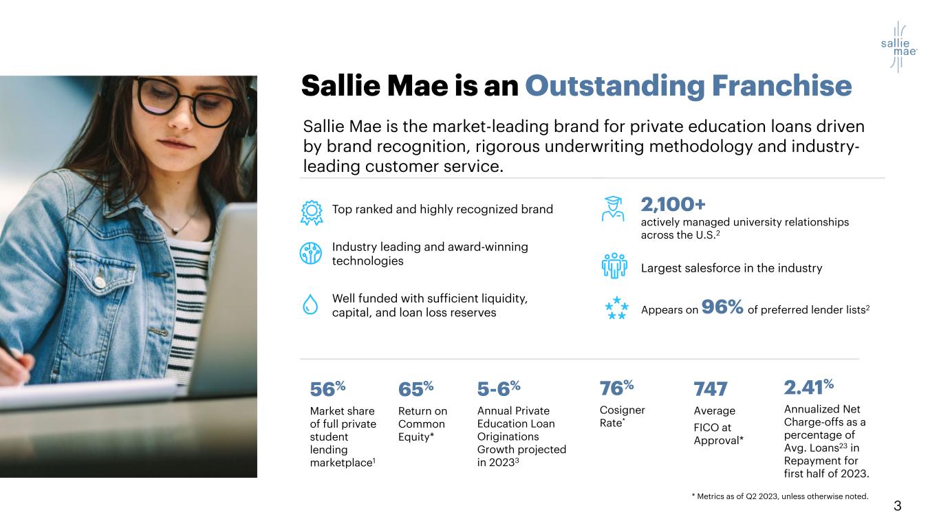 2 Forward-Looking Statements and Disclaimer Cautionary Note Regarding Forward-Looking Statements The following information is current as of July 26, 2023 (unless otherwise noted) and should be read in connection with the press release of SLM Corporation (the “Company”) announcing its financial results for the quarter ended June 30, 2023, the Form 10-Q for the quarter ended June 30, 2023, filed with the Securities and Exchange Commission (“SEC”) on July 26, 2023, and subsequent reports filed with the SEC. This Presentation contains “forward-looking” statements and information based on management’s current expectations as of the date of this Presentation. Statements that are not historical facts, including statements about the Company’s beliefs, opinions, or expectations and statements that assume or are dependent upon future events, are forward-looking statements. This includes, but is not limited to: statements regarding future developments surrounding COVID-19 or any other pandemic, including, without limitation, statements regarding the potential impact of COVID-19 or any other pandemic on the Company’s business, results of operations, financial condition, and/or cash flows; the Company’s expectation and ability to pay a quarterly cash dividend on its common stock in the future, subject to the determination by the Company’s Board of Directors, and based on an evaluation of the Company’s earnings, financial condition and requirements, business conditions, capital allocation determinations, and other factors, risks, and uncertainties; the Company’s 2023 guidance; the Company’s three-year horizon outlook; the Company’s expectation and ability to execute loan sales and share repurchases; the Company’s projections regarding originations, net charge-offs, non-interest expenses, earnings, balance sheet position, and other metrics; any estimates related to accounting standard changes; and any estimates related to the impact of credit administration practices changes, including the results of simulations or other behavioral observations. Forward-looking statements are subject to risks, uncertainties, assumptions, and other factors that may cause actual results to be materially different from those reflected in such forward-looking statements. These factors include, among others, the risks and uncertainties set forth in Item 1A. “Risk Factors” and elsewhere in the Company’s Annual Report on Form 10-K for the year ended Dec. 31, 2022 (filed with the SEC on Feb. 23, 2023) and subsequent filings with the SEC; the societal, business, and legislative/regulatory impact of pandemics and other public heath crises; increases in financing costs; limits on liquidity; increases in costs associated with compliance with laws and regulations; failure to comply with consumer protection, banking, and other laws; changes in accounting standards and the impact of related changes in significant accounting estimates, including any regarding the measurement of the Company’s allowance for credit losses and the related provision expense; any adverse outcomes in any significant litigation to which the Company or any subsidiary is a party; credit risk associated with the Company’s (or any subsidiary's) exposure to third parties, including counterparties to the Company’s (or any subsidiary's) derivative transactions; and changes in the terms of education loans and the educational credit marketplace (including changes resulting from new laws and the implementation of existing laws). The Company could also be affected by, among other things: changes in its funding costs and availability; reductions to its credit ratings; cybersecurity incidents, cyberattacks, and other failures or breaches of its operating systems or infrastructure, including those of third-party vendors; damage to its reputation; risks associated with restructuring initiatives, including failures to successfully implement cost-cutting programs and the adverse effects of such initiatives on the Company’s business; changes in the demand for educational financing or in financing preferences of lenders, educational institutions, students, and their families; changes in law and regulations with respect to the student lending business and financial institutions generally; changes in banking rules and regulations, including increased capital requirements; increased competition from banks and other consumer lenders; the creditworthiness of customers; changes in the general interest rate environment, including the rate relationships among relevant money-market instruments and those of earning assets versus funding arrangements; rates of prepayments on the loans owned by the Company and its subsidiaries; changes in general economic conditions and the Company’s ability to successfully effectuate any acquisitions; and other strategic initiatives. The preparation of the Company’s consolidated financial statements also requires management to make certain estimates and assumptions, including estimates and assumptions about future events. These estimates or assumptions may prove to be incorrect. All forward-looking statements contained in this Presentation are qualified by these cautionary statements and are made only as of the date of this Presentation. The Company does not undertake any obligation to update or revise these forward-looking statements to conform such statements to actual results or changes in its expectations. The Company reports financial results on a GAAP basis and also provides certain non-GAAP “Core Earnings” performance measures. The difference between the Company’s non-GAAP “Core Earnings” and GAAP results for the periods presented were the unrealized, mark-to-fair value gains/losses on derivative contracts (excluding current period accruals on the derivative instruments), net of tax. These are recognized in GAAP, but not in non-GAAP “Core Earnings” results. The Company provides non-GAA