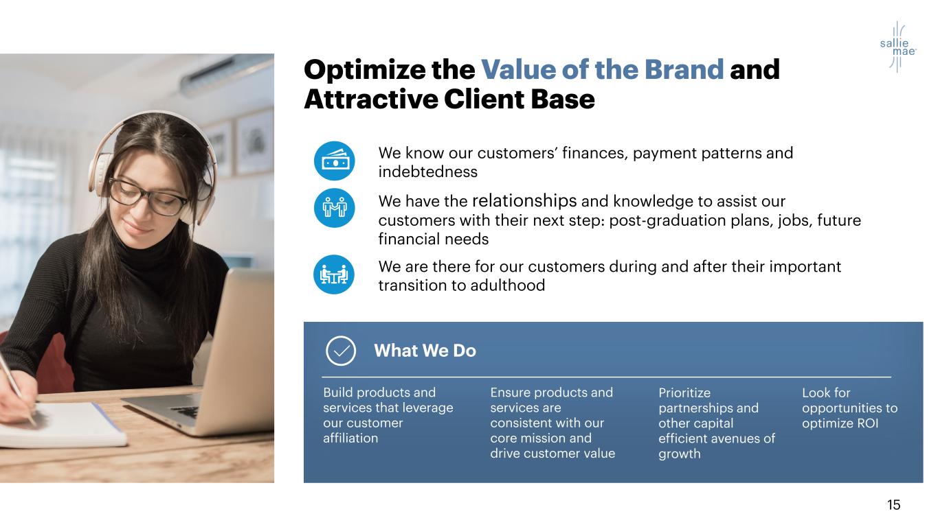 14 Sallie Mae’s Core Product Contains Customer Friendly Provisions That Enable Successful Outcomes In-School • Competitive variable & fixed rates • No origination fees • Three repayment options -Monthly interest payments -$25 fixed monthly payments -Defer payments • Quarterly FICO Score Sallie Mae Smart Option Student Loan Benefits from school through repayment Repayment • No prepayment penalty • Auto debit 0.25 percentage point interest rate reduction • Graduated repayment period • Cosigner release (for those who qualify) • Return-to-school deferment • Internship/residency deferment • Active-duty military deferment 92% of Sallie Mae student loan borrowers who are out of school are employed 5 Sallie Mae Student Borrowers