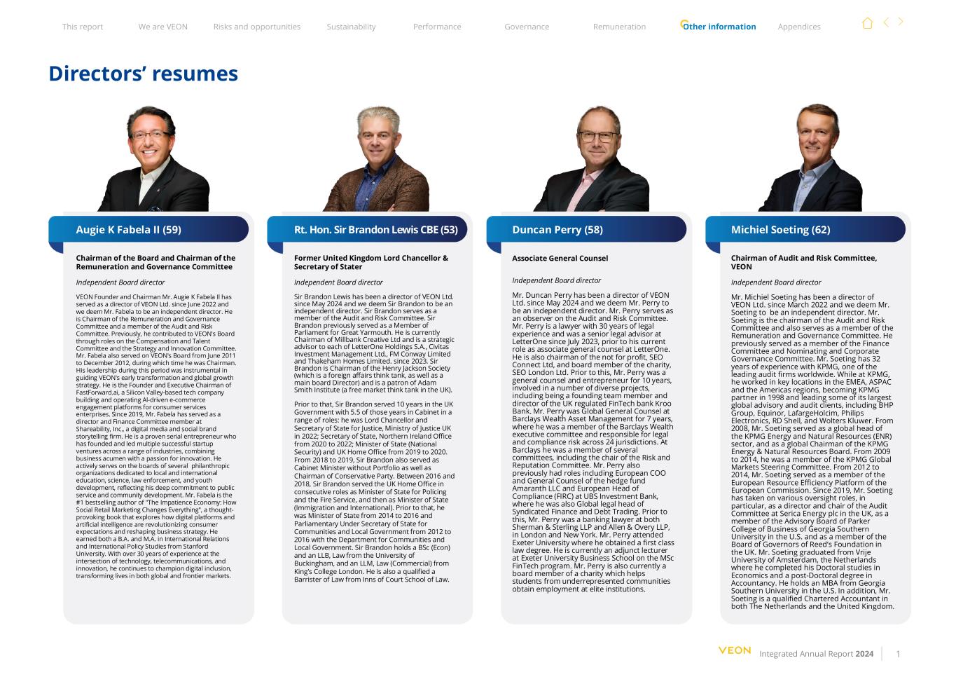 本报告我们是VEON风险与机遇可持续发展绩效治理薪酬其他信息附录综合年度报告2024 1董事简历Augie K Fabela II(59)RT. Hon. Sir Brandon Lewis CBE(53)Duncan Perry(58)Michiel Soeting(62)董事会主席兼薪酬与治理委员会主席独立董事会董事VEON创始人兼董事长Augie K Fabela IL先生自2022年6月起担任VEON Ltd.董事,我们认为Fabela先生为独立董事。他是薪酬和治理委员会主席以及审计和风险委员会成员。此前,他通过在薪酬和人才委员会以及战略与创新委员会任职,为VEON的董事会做出了贡献。Fabela先生还于2011年6月至2012年12月在VEON董事会任职,期间担任董事长。他在此期间的领导作用对于指导VEON的早期转型和全球增长战略发挥了重要作用。他是FastForward.ai的创始人和执行董事长,FastForward.ai是一家位于硅谷的科技公司,为消费者服务企业构建和运营Al驱动的电子商务参与平台。自2019年以来,Fabela先生在数字媒体和社交品牌故事讲述公司Shareability,Inc.担任董事和财务委员会成员。他是一位久经考验的连续创业者,曾在多个行业创立并领导多个成功的创业公司,将商业头脑与创新热情结合在一起。他积极担任多个致力于本地和国际教育、科学、执法和青年发展的慈善组织的董事会成员,这反映了他对公共服务和社区发展的坚定承诺。Fabela先生是《不耐烦的经济:社交零售营销如何改变一切》的#畅销书作者,这本发人深省的书探讨了数字平台和人工智能如何彻底改变消费者的期望并重塑商业战略。他在斯坦福大学获得了国际关系和国际政策研究的学士和硕士学位。他在科技、电信和创新的交叉领域拥有30多年的经验,继续倡导数字包容,改变了全球和前沿市场的生活。前英国大法官兼Stater独立董事会秘书Brandon Lewis爵士自2024年5月起担任VEON有限公司的董事,我们认为Brandon爵士是独立董事。布兰登爵士担任审计和风险委员会成员。布兰登爵士此前曾担任大雅茅斯议会议员。现任Millbank Creative Ltd董事长,自2023年起担任LetterOne Holdings S.A.、Civitas Investment Management Ltd.、FM Conway Limited和Thakeham Homes Limited各自的战略顾问。布兰登爵士是亨利·杰克逊协会(Henry Jackson Society,这是一个外交事务智囊团,同时也是主板董事)的主席,并且是亚当·斯密研究所(Adam Smith Institute,英国自由市场智库)的赞助人。在此之前,布兰登爵士在英国政府任职10年,其中5.5年在内阁担任过一系列职务:2022年担任英国司法部大法官兼司法大臣;2020年至2022年担任北爱尔兰办公室国务大臣;2019年至2020年担任国务大臣(国家安全)和英国内政部。从2018年到2019年,布兰登爵士还担任过内阁大臣,也是保守党主席。在2016年至2018年期间,布兰登爵士曾连续担任英国内政部警务和消防国务大臣,随后担任国务大臣(移民和国际事务)。在此之前,他曾于2014年至2016年担任国务部长,并于2012年至2016年在社区和地方政府部担任负责社区和地方政府的议会副国务秘书。布兰登爵士拥有英国白金汉大学法学学士(Econ)和法学学士学位,以及伦敦国王学院法学(商业)法学硕士学位。他还是Inns of Court School of Law的一名合格的大律师。协理总法律顾问独立董事会董事Duncan Perry先生自2024年5月起担任VEON有限公司的董事,我们认为Perry先生为独立董事。佩里先生担任审计和风险委员会的观察员。佩里先生是一名拥有30年法律经验的律师,自2023年7月起担任LetterOne的高级法律顾问,此前他目前担任LetterOne的副总法律顾问。他还是非营利组织SEO Connect Ltd的董事长,也是该慈善机构SEO London Ltd的董事会成员。在此之前,佩里先生担任了10年的总法律顾问和企业家,参与了多个不同的项目, 包括成为英国受监管金融科技银行KROO Bank的创始团队成员和董事。佩里先生曾在巴克莱银行财富资产管理公司担任全球总法律顾问7年,曾担任巴克莱银行财富执行委员会成员,负责24个司法管辖区的法律和合规风险。在巴克莱银行,他是几个委员会的成员,包括风险和声誉委员会的主席。佩里此前还担任过对冲基金Amaranth LLC的欧洲首席运营官和总法律顾问,以及瑞银投资银行的欧洲合规主管(FIRC),他也是该银行银团金融和债务交易的全球法律主管。在此之前,佩里曾在伦敦和纽约的Sherman & Sterling LLP和Allen & Overy LLP担任银行业律师。佩里先生就读于埃克塞特大学,在那里他获得了一流的法学学位。他目前是埃克塞特大学商学院MSC金融科技项目的兼职讲师。佩里目前还是一家慈善机构的董事会成员,该机构帮助来自代表性不足社区的学生在精英机构就业。审计与风险委员会主席、VEON独立董事会董事Michiel Soeting先生自2022年3月起担任VEON有限公司董事,我们认为Soeting先生为独立董事。Soeting先生是审计和风险委员会的主席,同时也是薪酬和治理委员会的成员。他此前曾担任财务委员会、提名和公司治理委员会成员。Soeting先生在毕马威会计师事务所拥有32年的工作经验,毕马威会计师事务所是全球领先的审计公司之一。在毕马威任职期间,他曾在欧洲、中东和非洲、ASPAC和美洲地区的关键地点工作,于1998年成为毕马威合伙人,并领导其一些最大的全球咨询和审计客户,包括必和必拓集团、Equinor、拉法基豪瑞、飞利浦电子、RD Shell和威科集团。从2008年起,Soeting先生担任毕马威能源和自然资源(ENR)部门的全球主管,以及毕马威能源与自然资源董事会的全球主席。2009年至2014年,他是毕马威全球市场指导