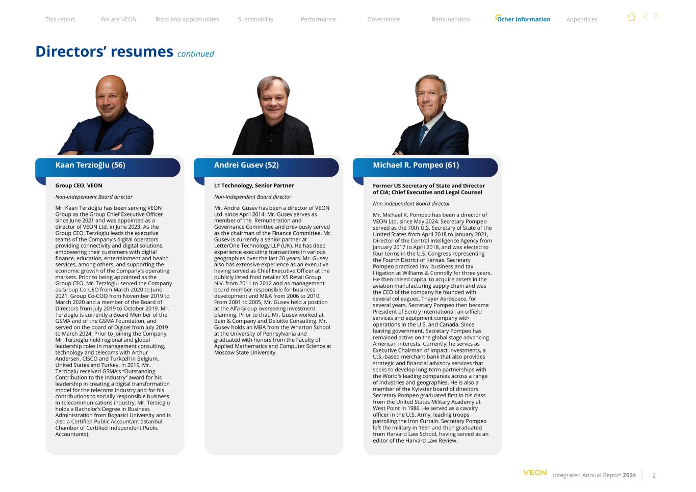 本报告我们是VEON风险与机遇可持续发展绩效治理薪酬其他信息附录综合2024年度报告2名董事履历续Kaan Terzio ğ lu(56)Andrei Gusev(52)Michael R. Pompeo(61)集团首席执行官、VEON非独立董事会董事Kaan Terzio ğ lu先生自2021年6月起任职于VEON Group,并于2023年6月获委任为VEON Ltd.的董事。作为集团首席执行官,Terzioglu领导公司数字运营商的执行团队,提供连接和数字解决方案,为其客户提供数字金融、教育、娱乐和健康服务等,并支持公司运营市场的经济增长。在被任命为集团首席执行官之前,Terzioglu先生曾于2020年3月至2021年6月担任公司联席首席执行官,于2019年11月至2020年3月担任集团联席首席运营官,并于2019年7月至2019年10月担任董事会成员。Terzioglu先生目前是GSMA和GSMA基金会的董事会成员,并于2019年7月至2024年3月期间担任Digicel董事会成员。在加入公司之前,Terzioglu先生曾在比利时、美国和土耳其的Arthur Andersen、CISCO和Turkcell担任管理咨询、技术和电信方面的区域和全球领导职务。2019年,Terzioglu先生因在为电信行业创造数字化转型模式方面发挥的领导作用以及在电信行业对社会负责的业务方面所做的贡献而获得GSMA“对行业的杰出贡献”奖。Terzioglu先生拥有Bogazici大学工商管理学士学位,同时也是一名注册会计师(伊斯坦布尔注册独立会计师协会)。L1科技、高级合伙人非独立董事会董事Andrei Gusev先生自2014年4月起担任VEON有限公司董事。Gusev先生担任薪酬和治理委员会成员,此前曾担任财务委员会主席。Gusev先生目前是LetterOne Technology LLP(英国)的高级合伙人。在过去20年里,他对在不同地区执行交易有着丰富的经验。Gusev先生还拥有丰富的高管经验,曾于2011年至2012年在上市食品零售商X5 Retail Group N.V.担任首席执行官,并于2006年至2010年担任管理委员会成员,负责业务发展和并购。2001年至2005年,Gusev先生在Alfa集团任职,负责监督投资规划。在此之前,Gusev先生曾任职于贝恩公司和德勤咨询公司。Gusev先生拥有宾夕法尼亚大学沃顿商学院MBA学位,并以优异成绩毕业于莫斯科国立大学应用数学和计算机科学学院。美国前国务卿、中央情报局局长;首席执行官兼法律顾问非独立董事会董事Michael R. Pompeo先生自2024年5月起担任VEON有限公司的董事。蓬佩奥国务卿曾于2018年4月至2021年1月担任美国第70任国务卿,2017年1月至2018年4月担任中央情报局局长,并在美国国会代表堪萨斯州第四选区当选四届。美国国务卿蓬佩奥在威廉姆斯 &康诺利公司从事了三年的法律、商业和税务诉讼业务。随后,他筹集资金收购了航空制造供应链中的资产,并担任了几年来他与几位同事Thayer Aerospace共同创立的公司的首席执行官。美国国务卿蓬佩奥随后成为Sentry International的总裁,该公司是一家在美国和加拿大开展业务的油田服务和设备公司。自卸任政府以来,蓬佩奥国务卿一直活跃在全球舞台上推进美国利益。目前,他担任Impact Investments的执行董事长,这是一家总部位于美国的商业银行,该银行还提供战略和财务咨询服务,寻求与跨多个行业和地区的世界领先公司建立长期合作伙伴关系。他也是基辅之星董事会成员。美国国务卿蓬佩奥1986年以全班第一名的成绩从美国西点军校毕业。他在美国陆军中担任骑兵军官,带领部队在铁幕上巡逻。蓬佩奥国务卿于1991年离开军队,随后毕业于哈佛法学院,曾担任《哈佛法律评论》的编辑。