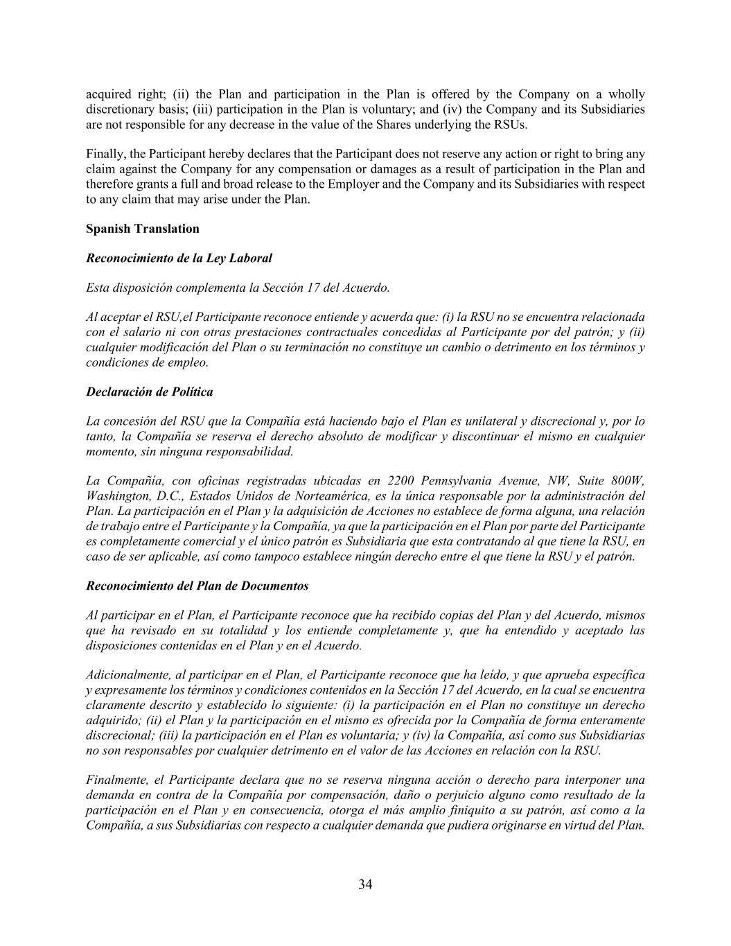 34项获得的权利;(ii)该计划和参与该计划由公司在完全酌情的基础上提供;(iii)参与该计划是自愿的;(iv)公司及其附属公司不对受限制股份单位的基础股份价值的任何下降负责。最后,参与者在此声明,参与者不保留因参与计划而向公司提出任何赔偿或损害索赔的任何行动或权利,因此就计划下可能产生的任何索赔向雇主和公司及其子公司提供全面和广泛的免责声明。西班牙文翻译Reconocimiento de la Ley Laboral Esta disposici ó n complementa la Secci ó n 17 del Acuerdo。Al aceptar el RSU,el Participante recoce entiende y acuerda que:(i)la RSU no se encuentra relacionada con el salario ni con otras prestaciones contractuales concedidas al Participante por del patr ó n;y(ii)cualquier modificaci ó n del Plan o su terminaci ó n no constituye un cambio o detrimento en los t é rminos y condiciones de empleo。Declaraci ó n de pol í tica la concesi ó n del RSU que la Compa ñ í a est á haciendo bajo el Plan是单方面的和酌情的,因此,la Compa ñ í a se reserva el derecho absoluto de modificar y discontinuar el mismo en cualquier momento,sinninguna responsabilidad。La Compa ñ í a,con oficinas registradas ubicadas en 2200 Pennsylvania Avenue,NW,Suite 800W,Washington,D.C.,Estados Unidos de Norteam é rica,es la ú nica responsable por la administraci ó n del Plan。La participaci ó n en el Plan y la acquisici ó n de acciones no establece de forma alguna,una relaci ó n de trabajo entre el Participante y la Compa ñ í a,ya que la participaci ó n en el Plan por parte del Participante es completely commercial and el ú nico patr ó n es Subsidiaria que esta contratando al que tiene la RSU,en caso de ser applicable,as í como tampoco establece ning ú n derecho entre el que tiene la RSU y el patr ó n。Reconocimiento del Plan de Documentos Al participar en el Plan,el Participante recoce que ha recibido copias del Plan y del Acuerdo,mismos que ha revisado en su totalidad y los entiende completamente y,que ha entendido y acceptado las disposiciones contenidas en el Plan y en el Acuerdo。此外,当参与者参与该计划时,参与者认识到他阅读了该计划,并明确批准了《协议》第17节中包含的具体条款和条件,其中明确描述并确立了以下内容:(i)对该计划的参与不构成所获得的权利;(ii)该计划和对其参与由公司完全酌情提供;(iii)对该计划的参与是自愿的;(iv)公司,as í como sus subsidiarias no son responsables por cualquier detrimento en el valor de las acciones en relaci ó n con la RSU。Finalmente,el Participante declares that no se reserva ninguna acci ó n o derecho para interponer una demanda on contra de la Compa ñ í a por compensaci ó n,da ñ o or perjuicio alguno como resultado de la participaci ó n in el Plan y en consecuencia,otorga el m á s amplio finiquito a su patr ó n,as í como a la Compa ñ í a,a sus subsidiarias on respecto a cualquier demanda que pudiera originarse en en en virtud del Plan y in consecuencia,