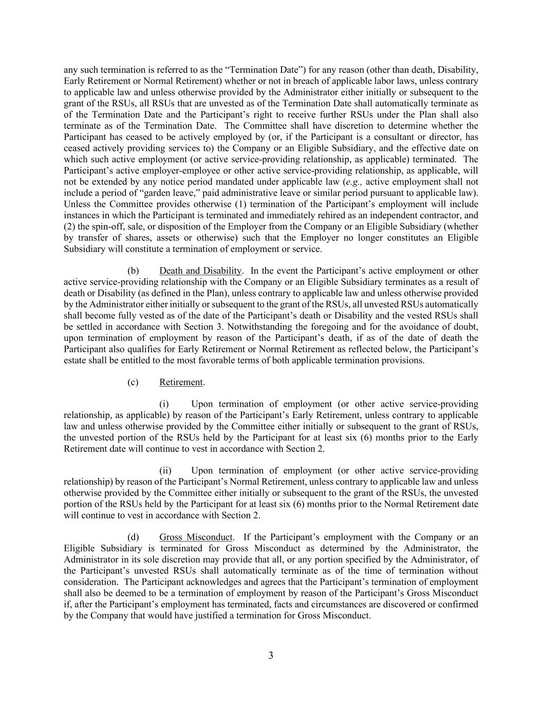3任何此类终止被称为“终止日期”)出于任何原因(死亡、残疾、提前退休或正常退休除外),无论是否违反适用的劳动法,除非违反适用法律,并且除非管理人在最初或在授予RSU之后另有规定,截至终止日期未归属的所有RSU应自终止日期起自动终止,参与者根据计划获得进一步RSU的权利也应自终止日期起终止。委员会有酌情决定权决定该参与者是否已停止积极受雇于公司或合资格附属公司(或,如该参与者为顾问或董事,则已停止积极向其提供服务),以及该积极受雇(或积极提供服务关系,如适用)终止的生效日期。参与者的在职雇主-雇员或其他在职服务提供关系(如适用)将不会因适用法律规定的任何通知期而延长(例如,在职不应包括一段“游园假”、带薪行政假或根据适用法律规定的类似期限)。除非委员会另有规定(1)终止参与者的雇用将包括终止参与者并立即重新雇用为独立承包商的情况,以及(2)将雇主从公司或合格子公司分拆、出售或处置(无论是通过转让股份、资产或其他方式)使雇主不再构成合格子公司将构成终止雇用或服务。(b)死亡和残疾。若参与者与公司或合资格附属公司的积极就业或其他积极提供服务的关系因死亡或残疾(如计划所定义)而终止,除非违反适用法律,且除非管理人在授予受限制股份单位之初或之后另有规定,所有未归属的受限制股份单位应自动成为自参与者死亡或残疾之日起全部归属,且已归属的受限制股份单位应根据第3节结算。尽管有上述规定,为免生疑问,在因参与者死亡而终止雇用时,如果在死亡之日,参与者也符合以下所示的提前退休或正常退休的资格,则参与者的遗产应有权享受这两项适用的终止条款的最优惠条款。(c)退休。(i)一旦因参与者提前退休而终止雇用(或适用的其他主动提供服务关系),除非违反适用法律,且除非委员会在最初或在授予RSU之后另有规定,否则参与者在提前退休日期前至少六(6)个月内持有的未归属的RSU部分将继续根据第2节归属。(ii)一旦因参加者的正常退休而终止雇用(或其他主动提供服务的关系),除非违反适用法律,且除非委员会在最初或在批出受限制股份单位后另有规定,该参加者在正常退休日期前至少六(6)个月持有的受限制股份单位的未归属部分将继续按照第2条归属。(d)严重不当行为。如参与者在公司或合资格附属公司的雇用因管理人确定的严重不当行为而终止,管理人可全权酌情规定,自终止时起,参与者未归属的RSU的全部或管理人指定的任何部分应自动终止,而无需考虑。参与者承认并同意,如果在参与者的雇佣终止后,公司发现或确认了本可以证明因严重不当行为而终止雇佣的事实和情况,则该参与者的终止雇佣也应被视为因参与者的严重不当行为而终止雇佣。