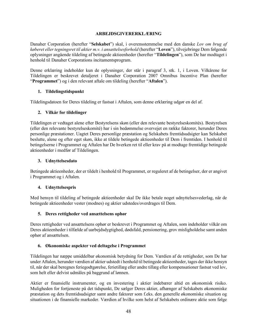 48 ARBEJDSGIVERERKL æ ring 丹纳赫公司(hereFter“Selskabet”)skal,i overensstemmelse med den danske lov om brug af k ø beret eller tegningsret til aktier m.v. i ans æ ttelsesforhold(hereFter“Loven”),tilvejebringe dem f ø lgende oplysninger ang å ende tildeling af betingede aktieenheder(hereFter“Tildelingen”),som de har modtaget i henhold til 丹纳赫 corporations incitamentsprogram。Denne erkl æ ring indeholder kun de oplysninger,der st å r i paragraf 3,stk。1、我爱过。Vilk å rene for Tildelingen er beskrevet detaljeret i 丹纳赫公司 2007年综合激励计划(herefter“Programet”)og i den relevant aftale om tildeling(herefter“Aftalen”)。1.Tildelingstidspunkt Tildelingsdatoen for deres tildeling er fastsat i Aftalen,som denne erkl æ ring udg ø r en del af。2.Vilk å r for tildelinger Tildelingen er vedtaget alene efter bestyrelsenssk ø n(eller den related bestyrelseskomit é s)。Bestyrelsen(eller den related bestyrelseskomit é)har i sin bed ø mmelse overvejet en r æ kke faktorer,herunder deres personlige pr æ stationer。Uagtet Deres personlige pr æ station og Selskabets fremtidsudsigter kan Selskabet beslutte,alene og efter eget sk ø n,ikke at tildele betingede aktieenheder til dem i fremtiden。I henhold til betingelserne i programmet og aftalen har de hverken ret til eller krav p å at modtage fremtidige betingede aktieenheder i medf ø r af tildelingen。3.Udnyttelsesdato Betingede aktieenheder,der er tildelt i henhold til programet,er reguleret af de betingelser,der er angivet i programet og i aftalen。4.Udnyttelsespris med hensyn til tildeling af betingede aktieenheder skal de ikke betale noget udnyttelsesvederlag,n å r de betingede aktieenheder vester(modnes)og aktier udstedes/overdrages til dem。5.Deres rettigheder ved ans æ ttelsens op ø r deres rettigheder ved ans æ ttelsens op ø r er beskrevet i programet og Aftalen,som indeholder vilk å r om deres aktieenheder i tilf æ lde af uarbejdsdygtighed,d ø dsfald,pensionering,grov misligholdelse samt anden op ø r af ans æ ttelsen。6.Ø konomiske aspekter ved deltagelse i programet Tildelingen har n æ ppe umiddelbar ø konomisk betydning for Dem。V æ rdien af de rettigheder,som de har under Aftalen,herunder v æ rdien af aktier udstedt i henhold til betingede aktieenheder,tages der ikke hensyn til,n å r der skal beregnes feriegodtg ø relse,ferietill æ g eller andre till æ g eller kompensationer fastsat ved lov,som helt eller delvist udm å les p å baggrund af l ø nnen。Aktier er finansielle instrumenter,og eninvestering i aktier indeb æ rer altid en ø konomisk risiko。muligheden for fortjeneste p å det tidspunkt,de s æ lger deres aktier,afh æ nger af selskabets ø konomiske pr æ station og dets fremtidsudsigter samt andre faktorer som f.eks. den generelle ø konomiske situation og situationen i de finansielle markeder。V æ rdien af hvilke som helst af selskabets ordin æ re aktie som f ø lge