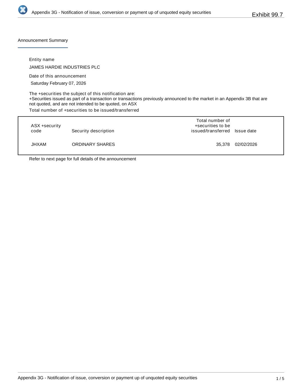 附录3G-未上市股本证券的发行、转换或缴款通知附录3G-未上市股本证券的发行、转换或缴款通知1/5公告摘要实体名称JAMES HARDIE INDUSTRIES PLC本公告日期星期六2月7日,2026本通知标的的+证券为:拟发行/转让的+证券总数/ASX +证券代码证券说明拟发行/转让的+证券总数/发行日期JHXAM普通股35,37802/02/2026请参阅下一页,了解公告+作为交易的一部分而发行的证券或先前在附录3B中向市场公布的交易的全部详情,这些交易没有在丨澳交所报价,也不打算在ASX报价